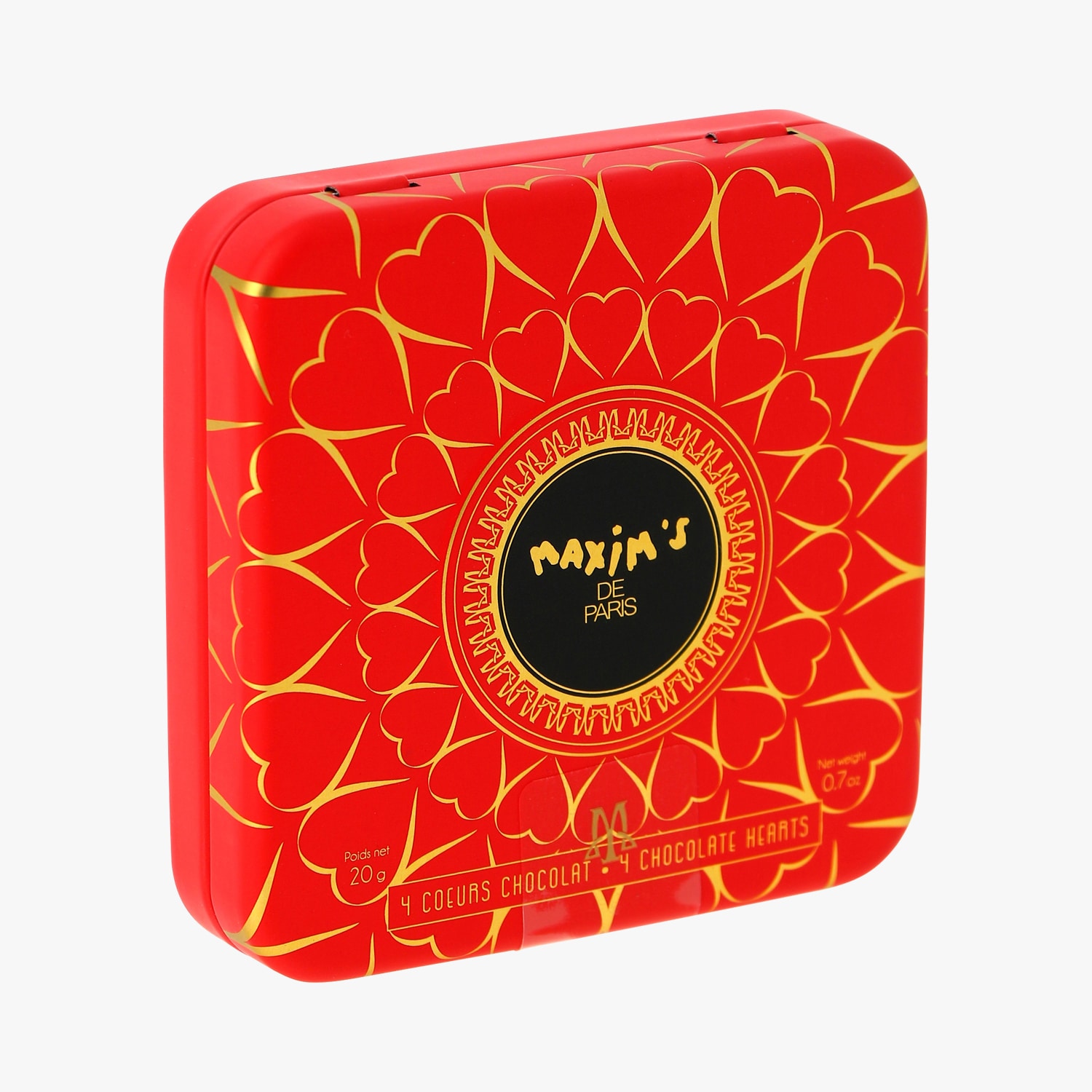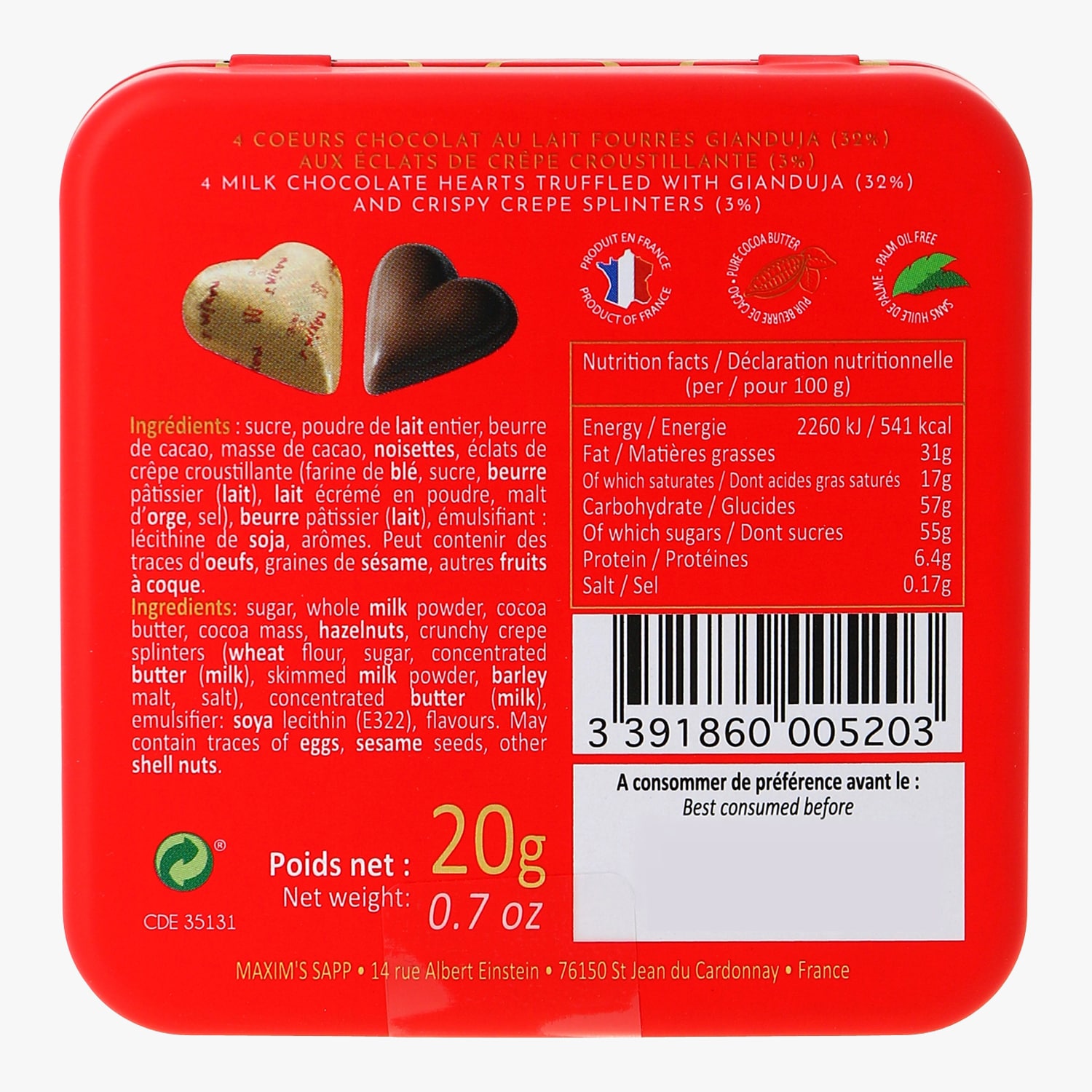 4 cœurs chocolat au lait fourrés Gianduja aux éclats de crêpe croustillante