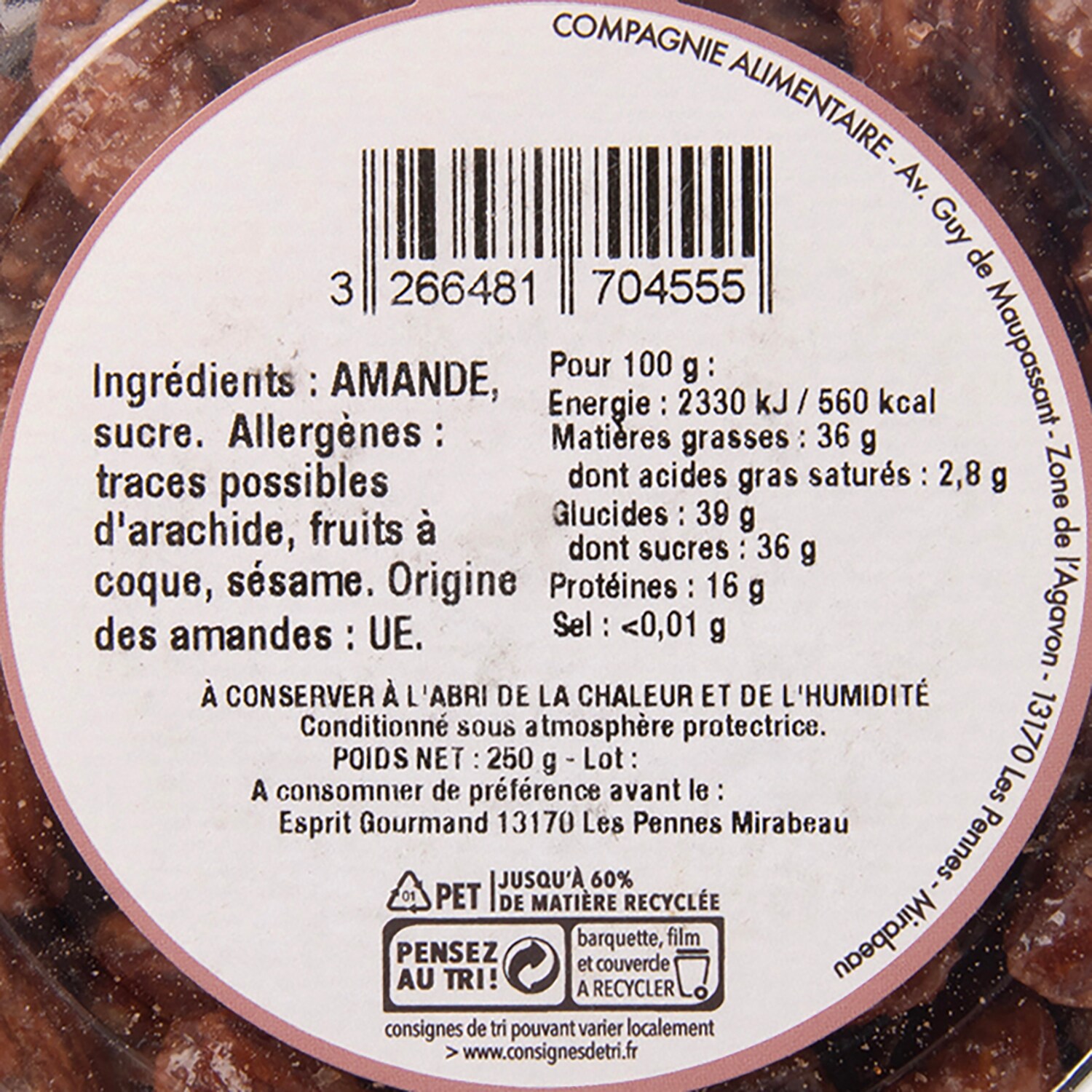 Rien d’autre que de généreuses amandes entières et du sucre de canne pour réaliser ce produit qui plaira aux gourmets et amateurs de noix. Fabriquées en Provence avec des produits nobles, ces amandes sont caramélisées dans des chaudrons en cuivre à l’ancienne en suivant un procédé qui permet de révéler toute leur saveur. Croquantes à souhait, ces amandes caramélisées se dégustent telles quelles, au goûter, en accompagnement d’un thé ou pour satisfaire les petites faims.