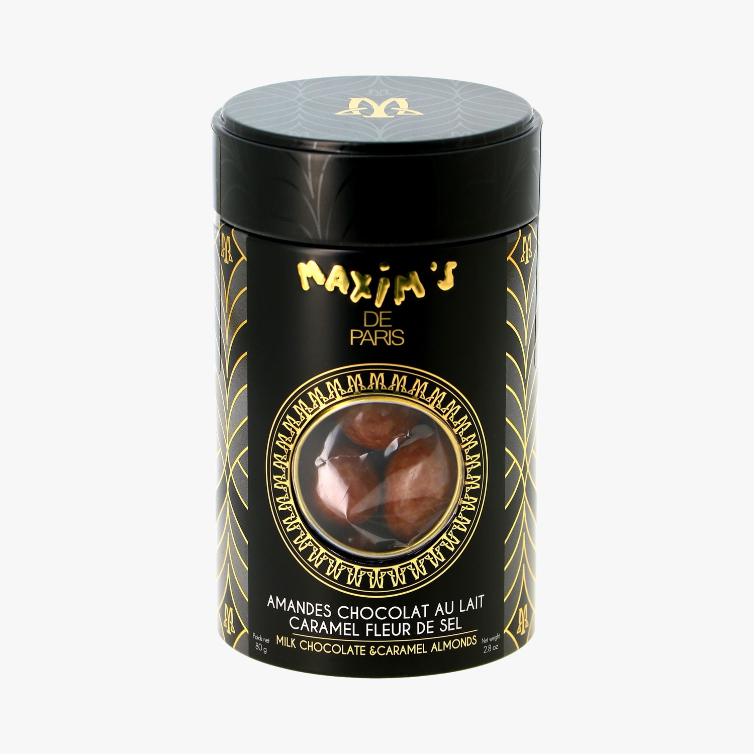 Amandes chocolat au lait, caramel fleur de sel, boîte métal