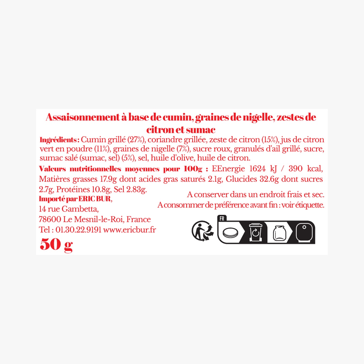 Assaisonnement à base de cumin, graines de nigelle, zestes de citron et sumac
