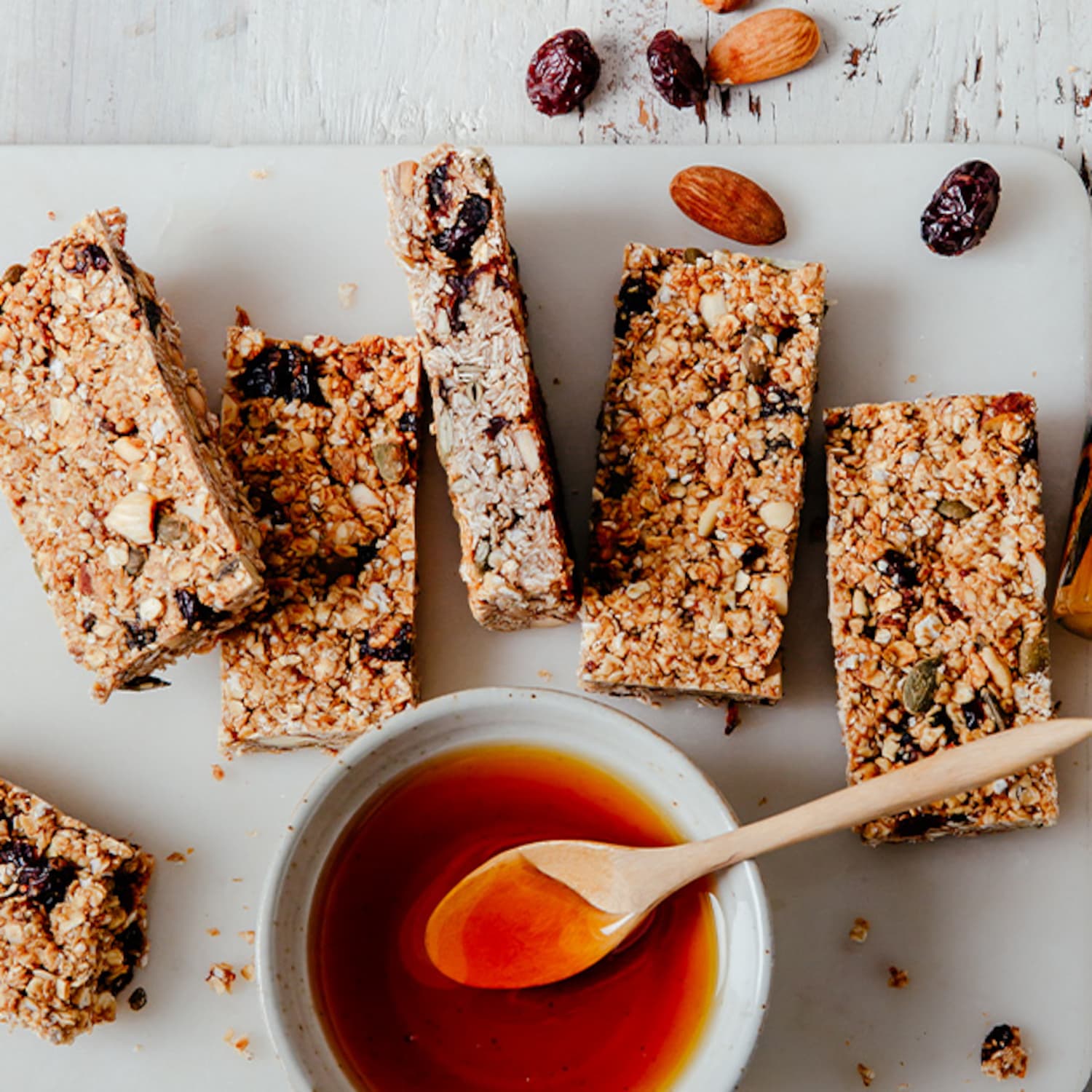 300 g de petits flocons d’avoine| 100 g d’amandes décortiquées et grossièrement hachées| 50 g de graines de courge| 10 dattes Medjool, dénoyautées et grossièrement hachées |50 g de cranberries, hachées |50 g d’abricots secs, découpés en petits cubes |100 g de miel liquide| 6 cuillères à soupe de beurre de cacahuète |1 pincée de fleur de sel |10 cl d’eau