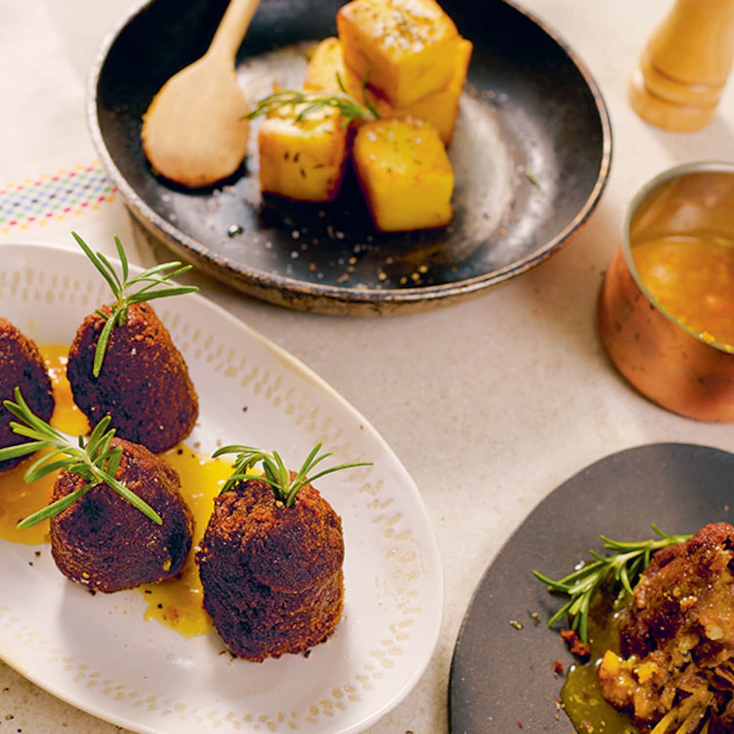 5Dans un plat, disposez les beignets piqués d'une branche de romarin. Nappez-les de sauce à l'orange. Ajoutez les pommes de terre.