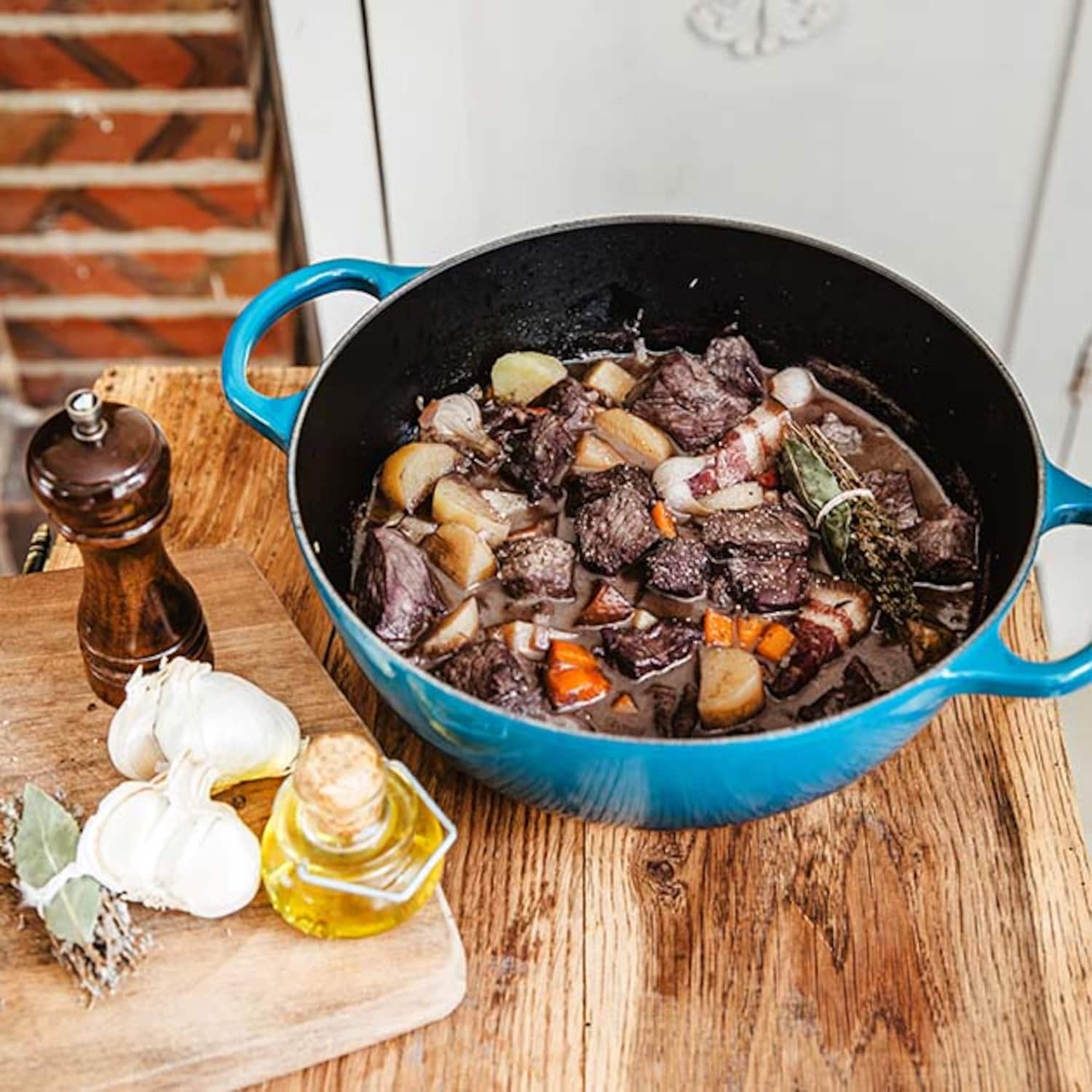 2Découpez le lard en de généreux morceaux. Ajoutez les dans la casserole avec les morceaux de bœuf. Versez le vin rouge, ajoutez le bouquet garni, un peu de bouillon, salez et poivrez. Ajoutez les pommes de terre et les oignons grelots.