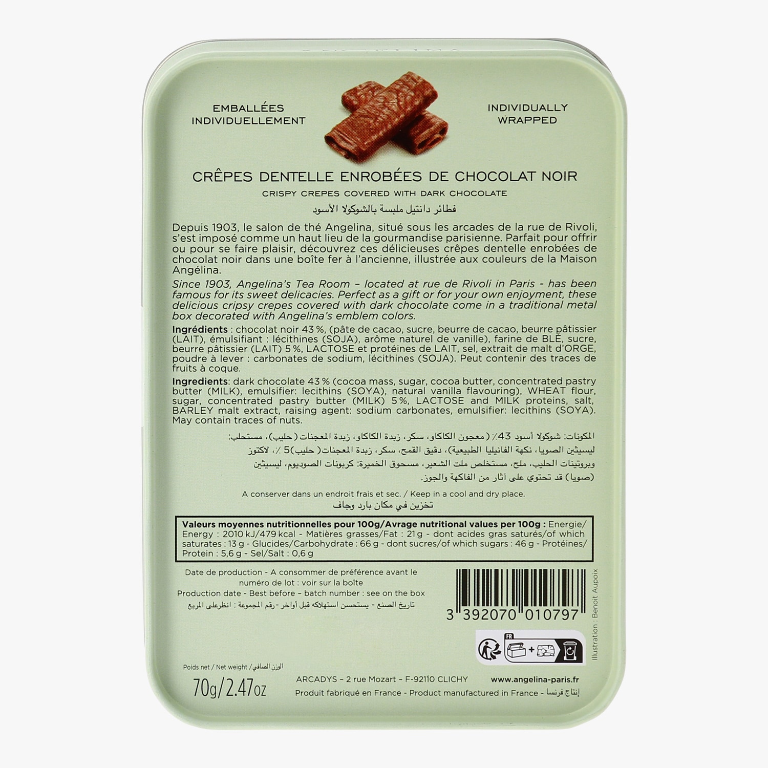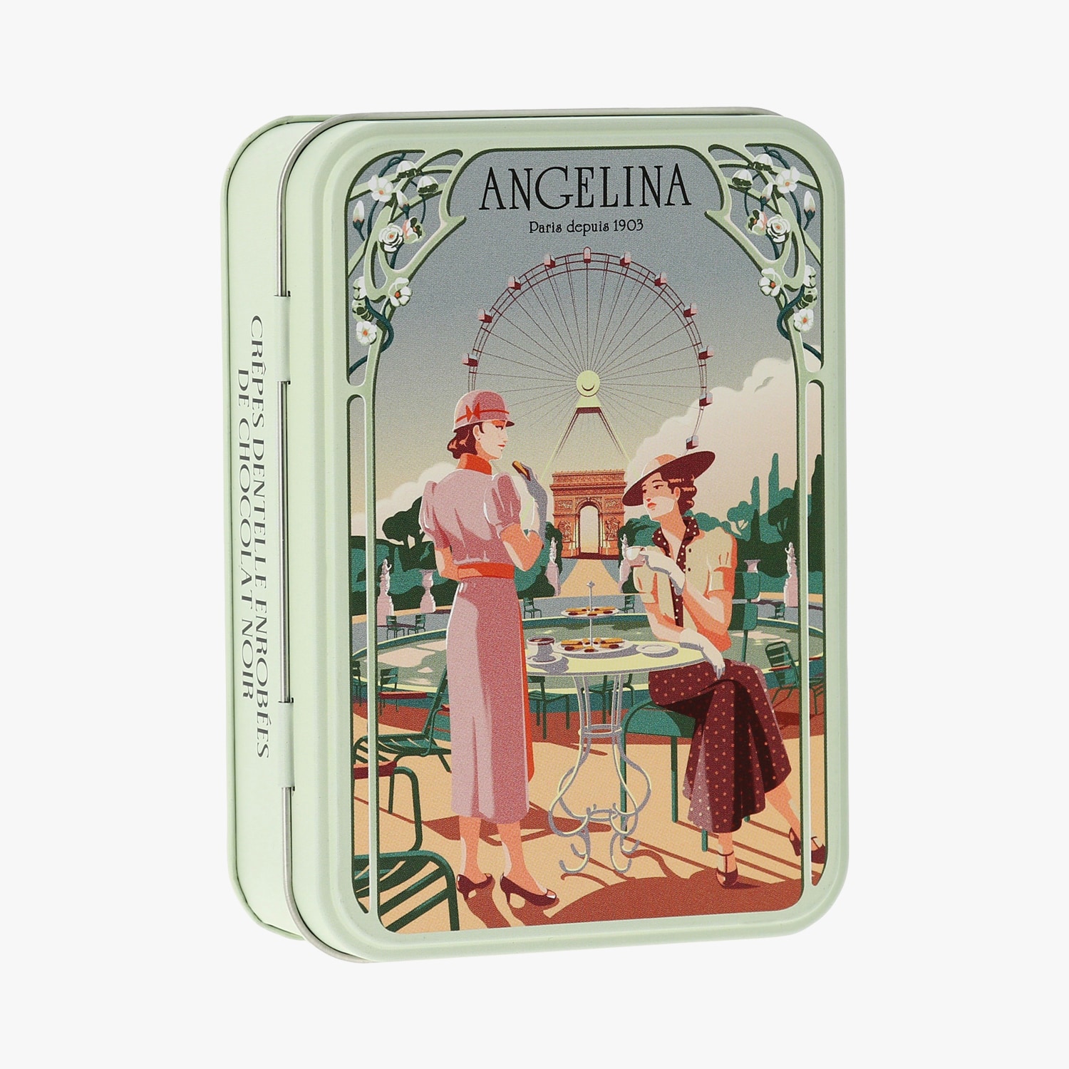 Boîte en fer crêpes dentelles enrobées de chocolat noir
