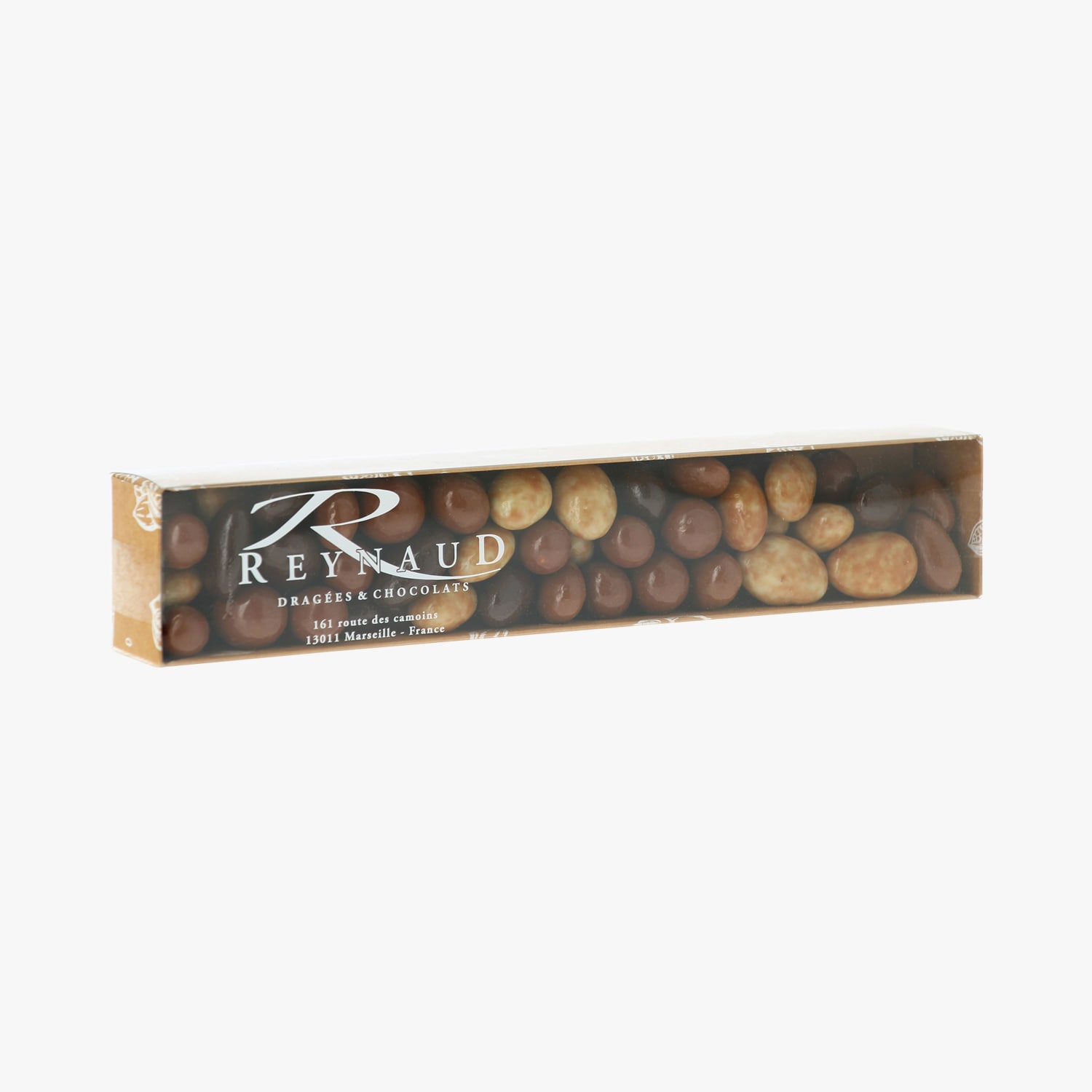 Amandes enrobées de chocolat noir et lait, nougat et noisettes enrobés de chocolat au lait
