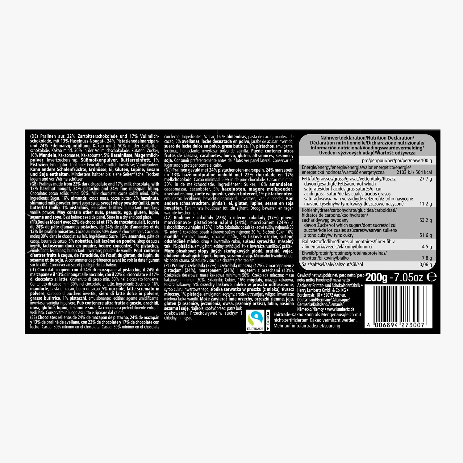 Boules Mozart chocolat fourré de pâte d'amandes-pistaches, pâte d'amandes et praliné