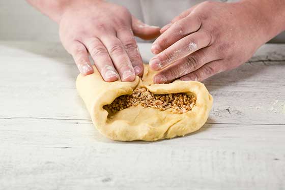6Repliez chaque morceau de pâte sur lui-même en formant une boule puis disposez-les en rond dans un cercle préalablement beurré.