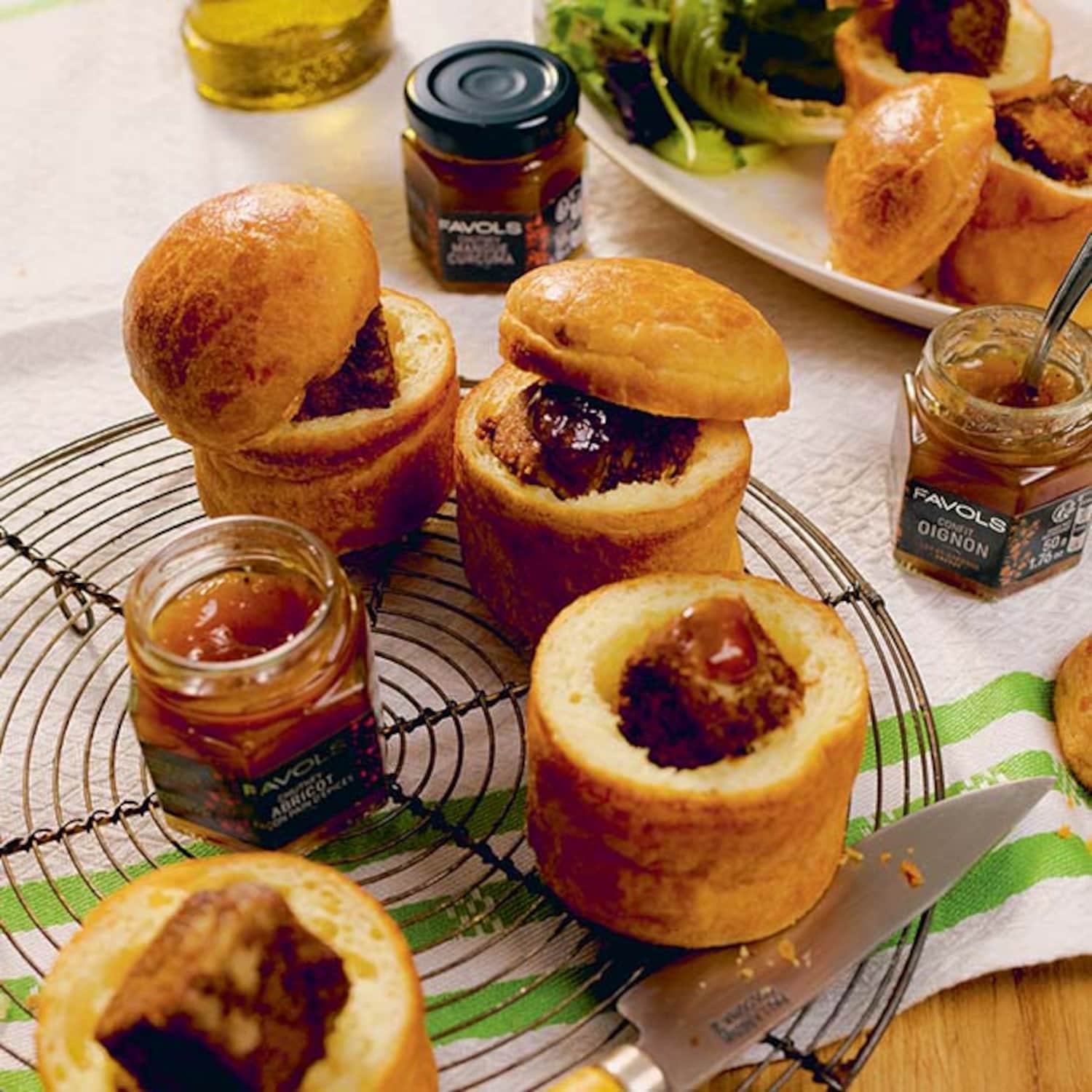 4Coupez le haut de chaque briochine, évidez-les pour y glisser un cube de foie gras pané et une cuillère à café de confit de fruits. Refermez avec le chapeau. Placez-les au four à 50°C pendant 6 à 7 minutes pour les réchauffer avant de servir.