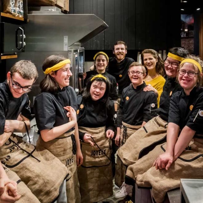 Initialement fondée à Rennes fin 2017 par Yann et Lydwine Bucaille, Café Joyeux est la première famille de cafés-restaurants qui emploie et forme des personnes en situation de handicap mental ou cognitif, au cœur de nos villes et de nos vies.
