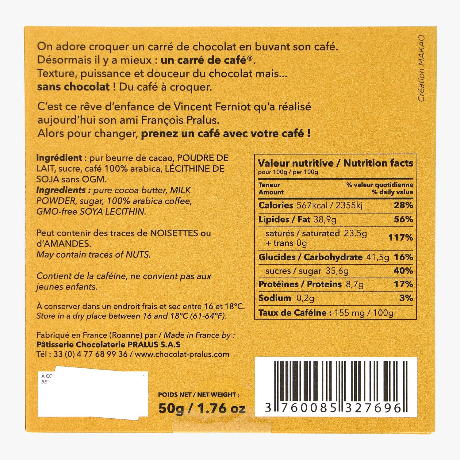 Carré de café, café au lait à croquer, pur arabica François Pralus