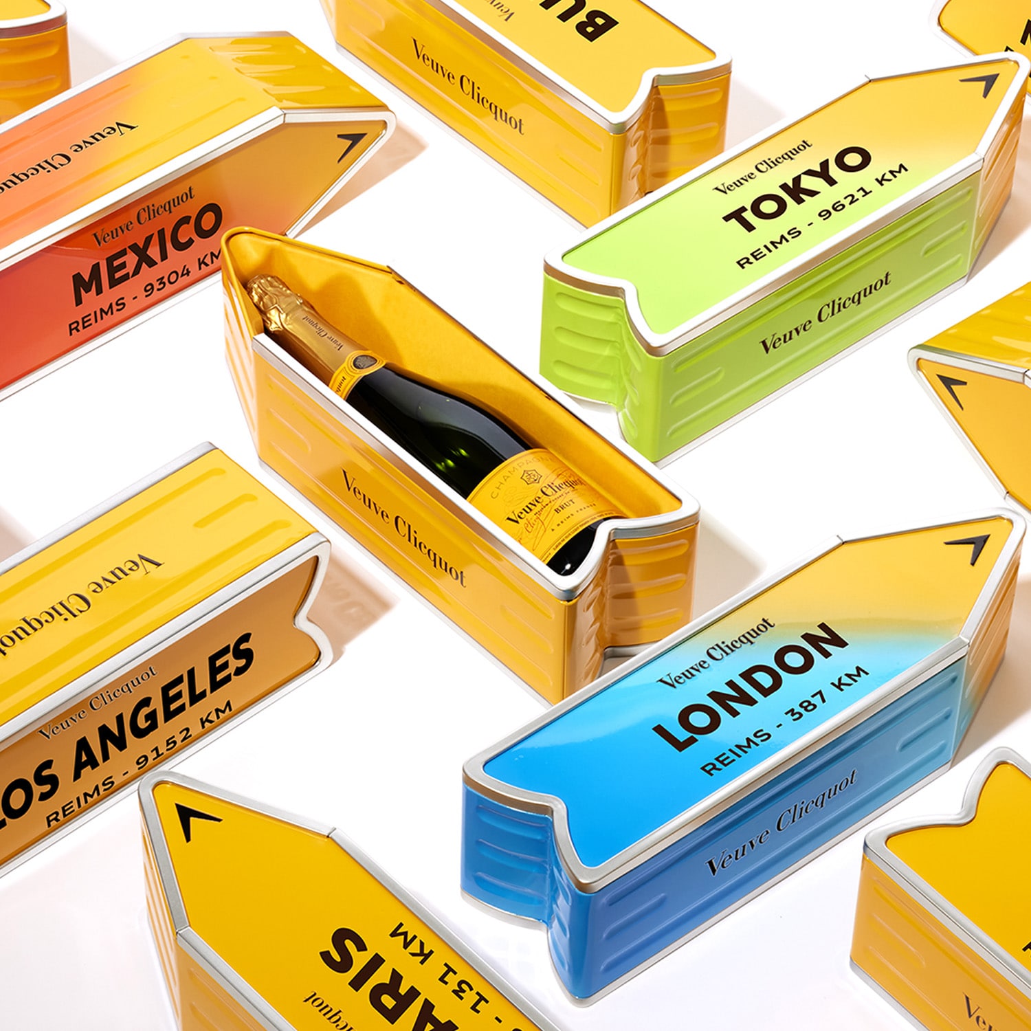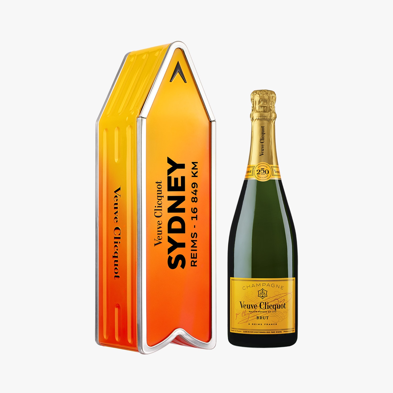 Champagne Veuve Clicquot Brut Carte Jaune édition limitée sous Coffret Arrow Sun orange
