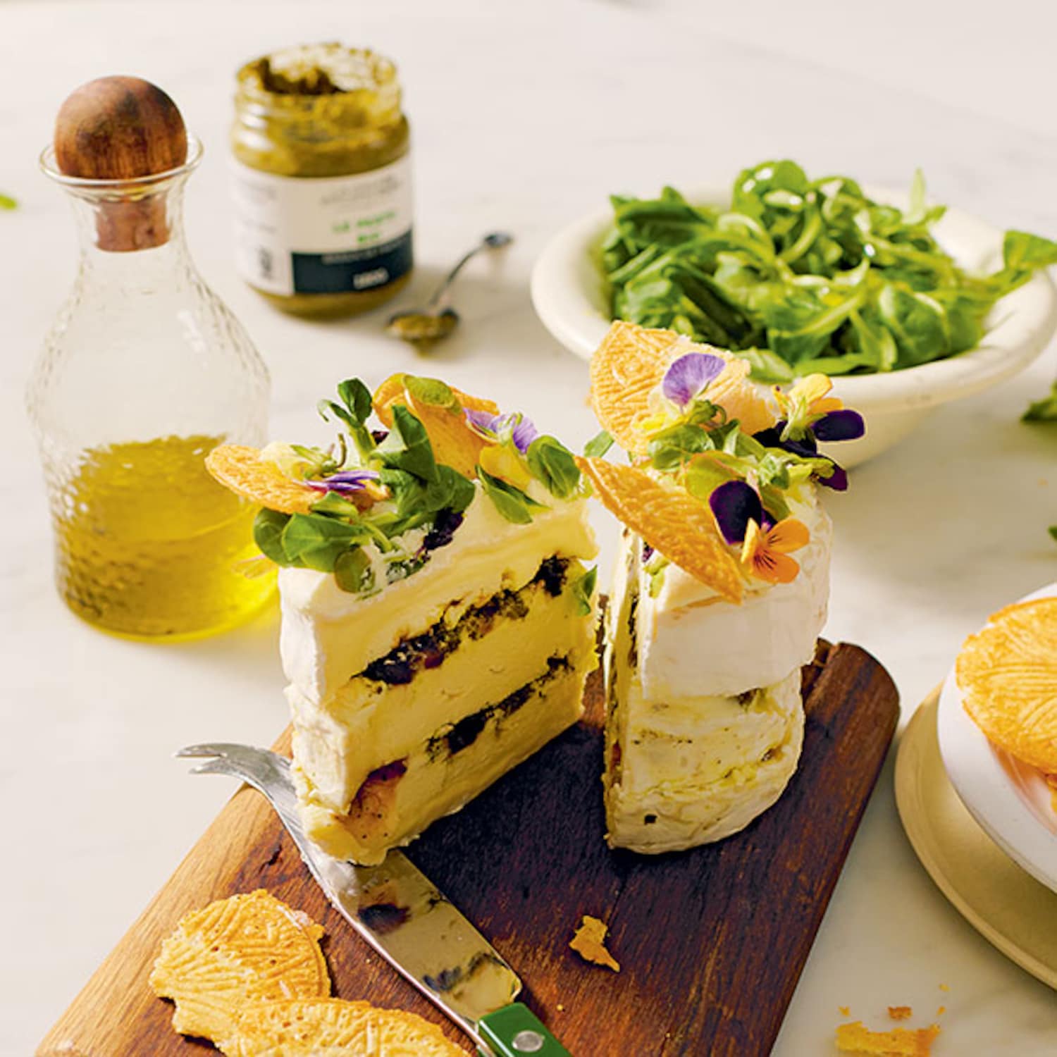 2Étalez le mascarpone sur l'étage supérieur. Poivrez chaque couche. Reconstituez le fromage.