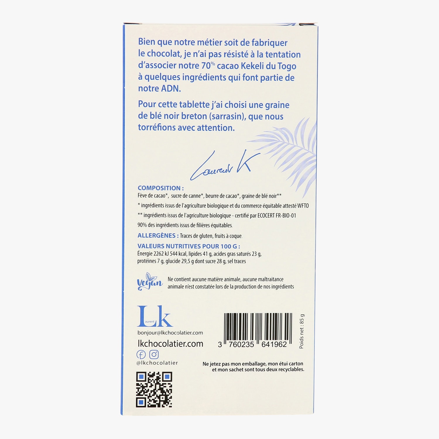 Chocolat noir 70 % cacao au blé noir torréfié (Sarrasin) Laurent K
