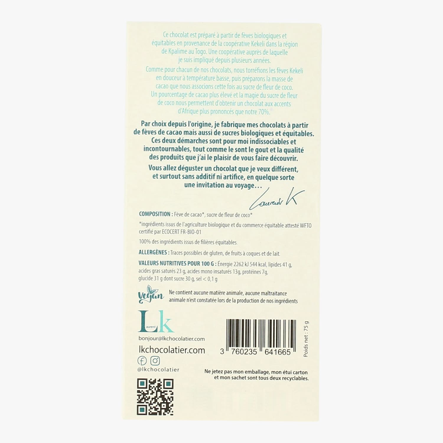 Chocolat noir 76 % cacao au sucre de fleur de coco Laurent K