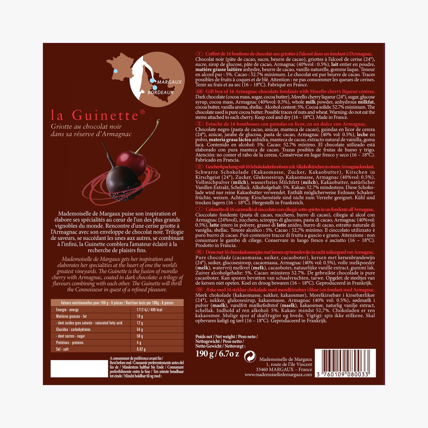 Coffret de 16 bonbons de chocolat aux griottes à l'alcool dans un fondant à l'Armagnac Mademoiselle de Margaux