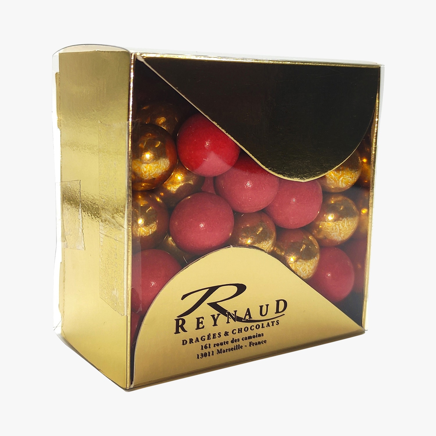Croustillant enrobé chocolat lait dragéifié doré et rouge