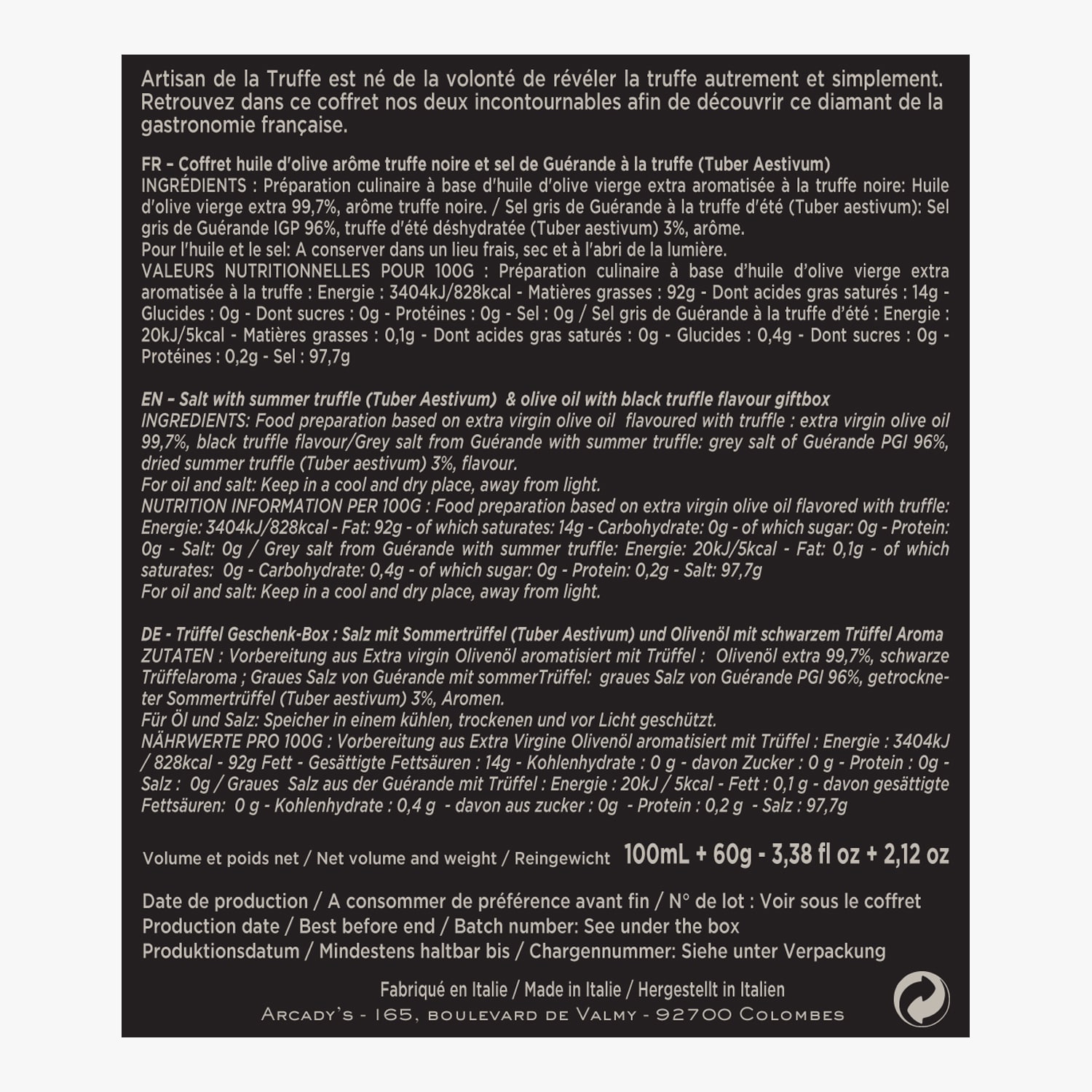 Coffret huile d’olive aromatisée à la truffe noire et mini sel de Guérande IGP à la truffe d’été