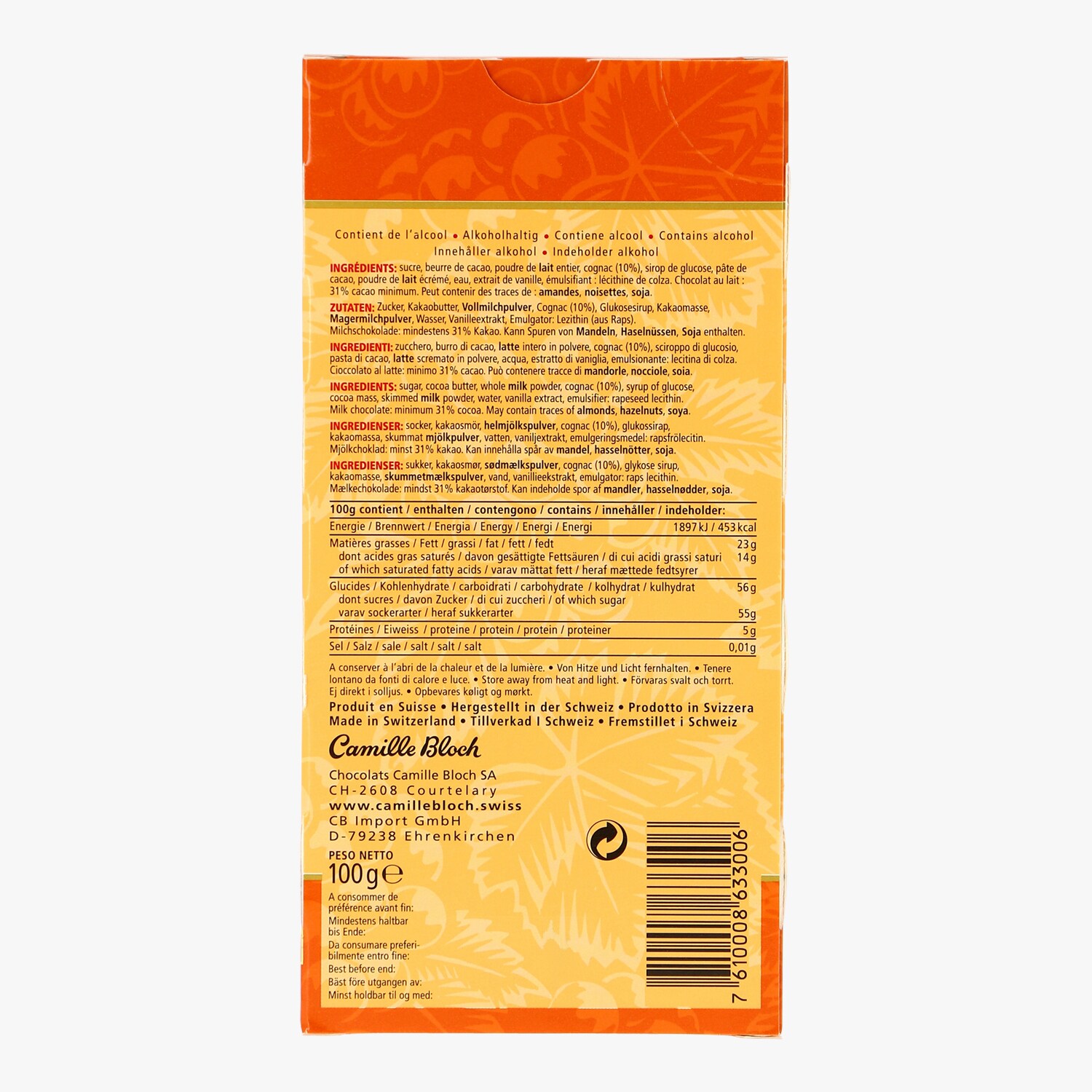 Tablette de chocolat au lait 31 % de cacao minimum fourré au cognac