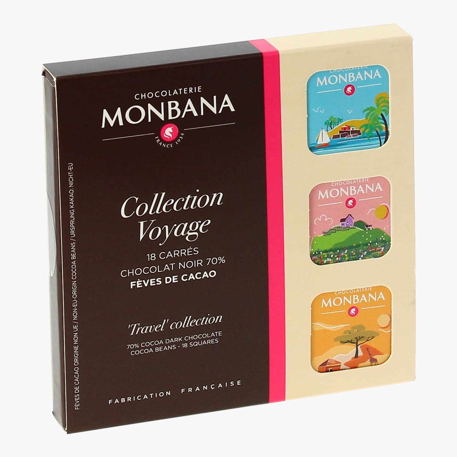 Collection Voyage - Assortiment de 18 carrés de chocolat noir 70 % cacao fèves de cacao