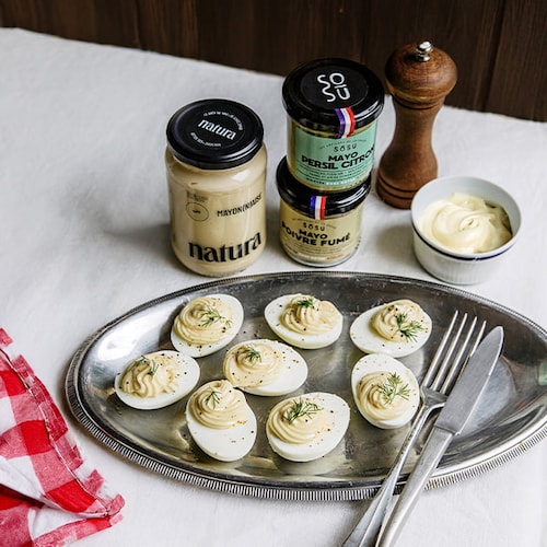 Omniprésent en gastronomie, l'œuf se fond avec aisance dans de nombreuses recettes du quotidien, de l'entrée jusqu’au dessert. Au-delà de sa fonction structurante, l'œuf est aussi un élément phare de nos assiettes, sublimé par des sauces mayonnaise d'exception. La maison française SOSU replace avec brio la sauce au cœur de l'assiette, en imaginant au rythme des saisons, des recettes créatives qui transforment chaque dégustation. La mayonnaise poivre fumé ajoute une touche d'audace à vos œufs mimosa, avec sa pointe de piquant subtile et ses arômes délicatement fumés, tandis que les notes herbacées d’une mayonnaise persil citron apportent fraicheur et légèreté. Martin Pouret, l’incontournable vinaigrier français, élabore une mayonnaise à la moutarde onctueuse, une création au goût authentique du terroir. Pour une touche sophistiquée, la mayonnaise à la truffe noire du Périgord 3% aromatisée de notre Collection transforme vos œufs et préparations culinaires en une expérience gourmet.