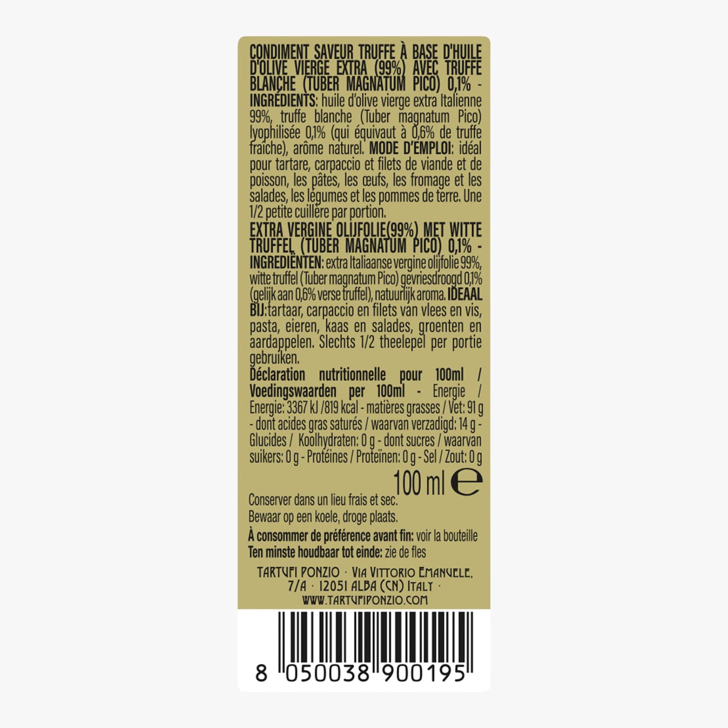 Condiment à base d'huile d'olive vierge extra saveur truffe blanche (Tuber magnatum Pico) Tartufi Ponzio