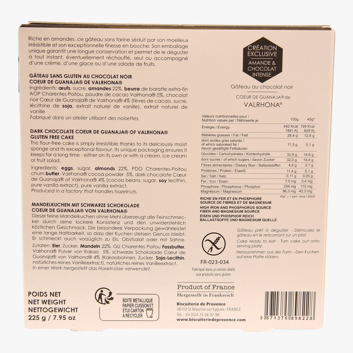 Gâteau sans gluten au chocolat noir cœur de Guanaja de Valrhona Biscuiterie de Provence