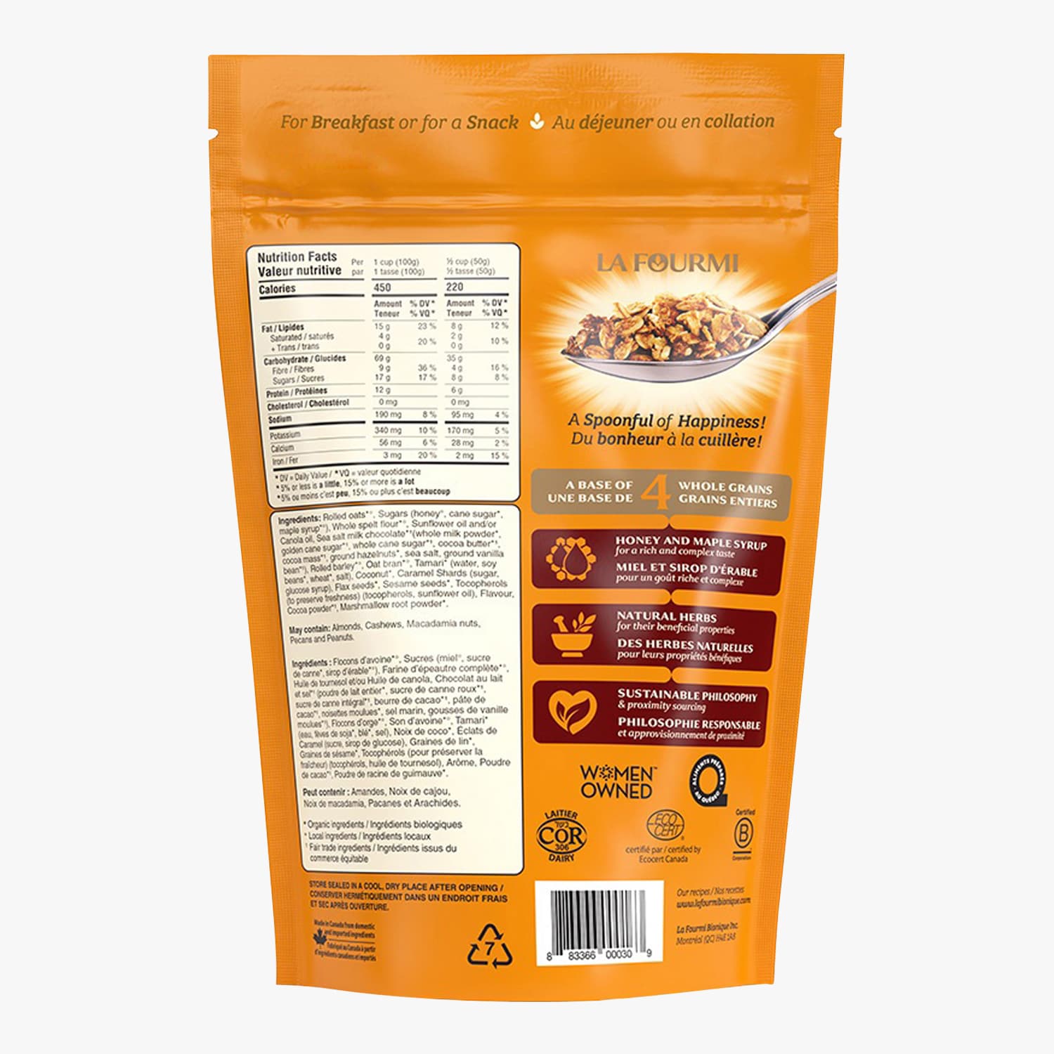 Mélange de céréales entières dorées au miel et au sirop d'érable, avec du chocolat au lait et des éclats de caramel
