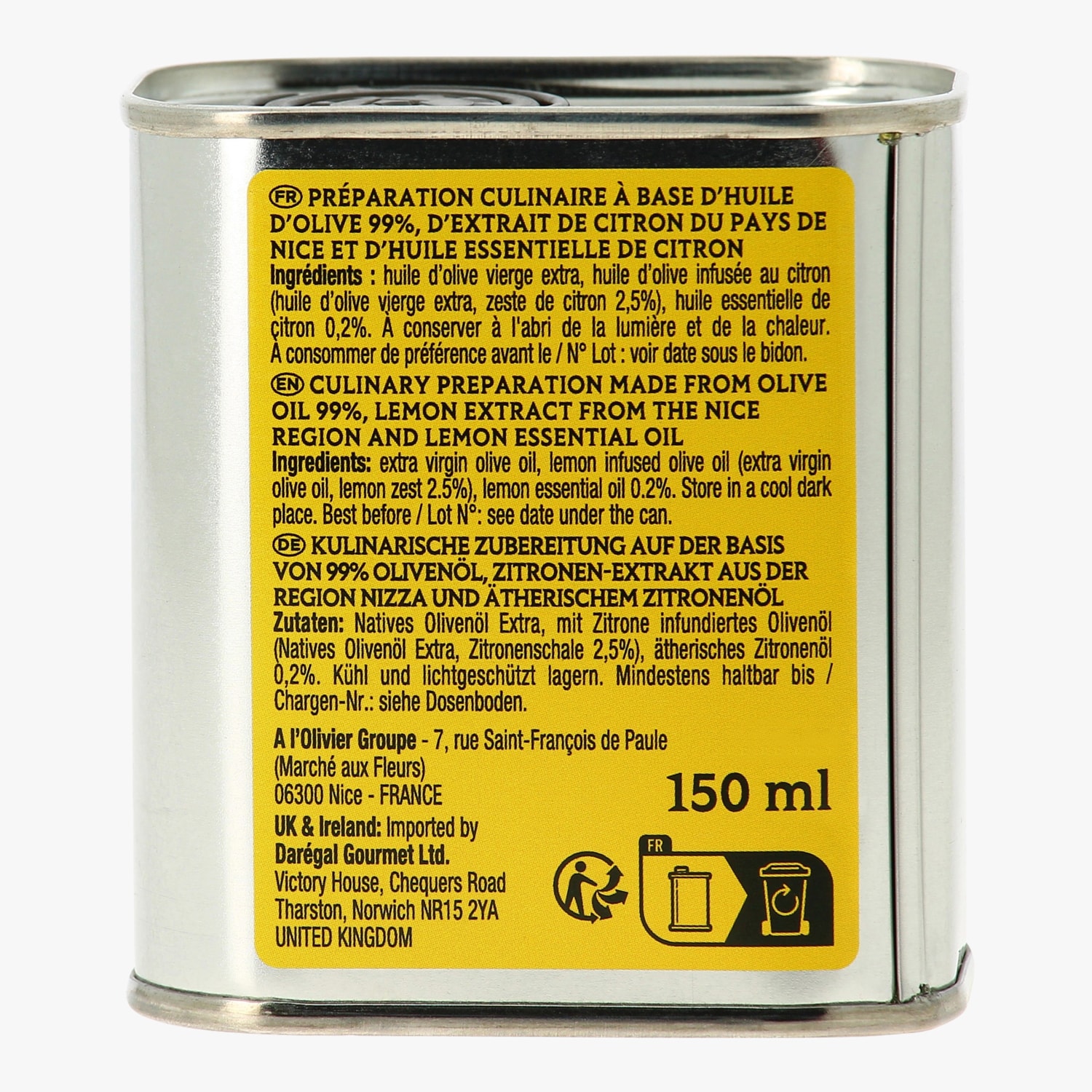 Préparation culinaire à base d'huile d'olive vierge extra 99 %, d'extrait de citron du pays de Nice et d'huile essentielle de citron