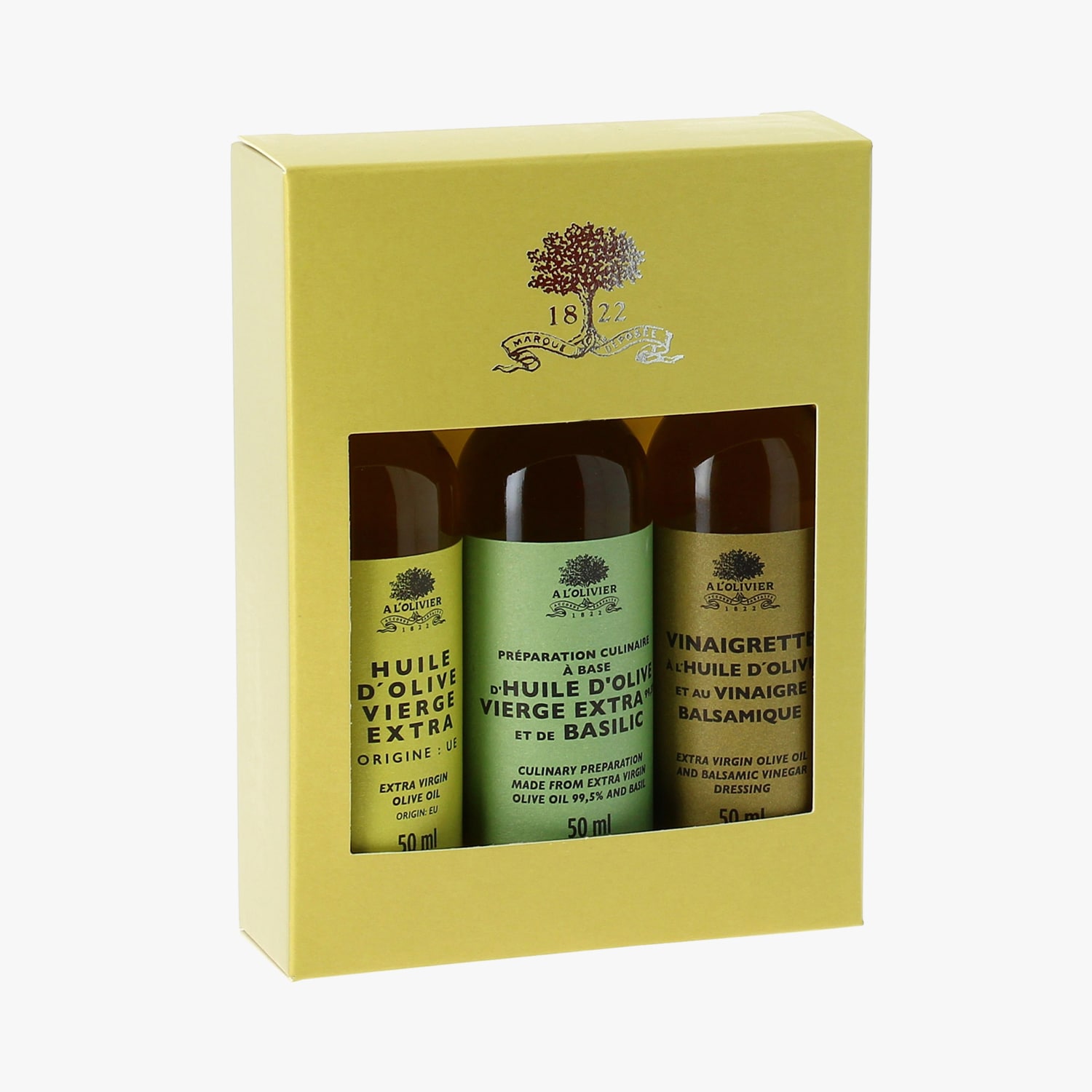 Huile d'olive vierge extra, préparation à base d'huile d'olive vierge extra et basilic, et vinaigrette à l'huile d'olive vierge extra et vinaigre balsamique