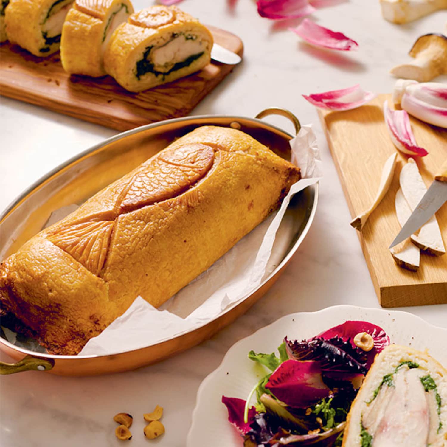 5Coupez le Koulibiac en rondelles. Servez avec la salade assaisonnée d'huile de noisette et parsemée de noisettes concassées.