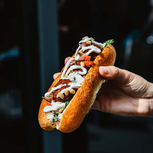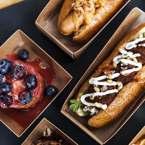 Pour les 10 ans du Food Market, découvrez les créations street food gourmandes et créatives des chefs de La Grande Épicerie de Paris spécialement imaginées pour l’occasion ! Côté salé, laissez-vous tenter par des hot dogs revisités, disponibles en trois versions et satisfaisant ainsi tous les palais : le hot dog classique avec une saucisse viennoise de porc ou bien une saucisse de volaille, agrémenté de condiment piquillos, de sauce mayonnaise sweet* chilly et d’oignons frits et la version veggie** avec un hot dog aux falafels composé d’une sauce raffinée au yaourt grec et au citron vert, agrémenté de pignons de pin torréfiés moutardés délicatement disposés sur le dessus.
