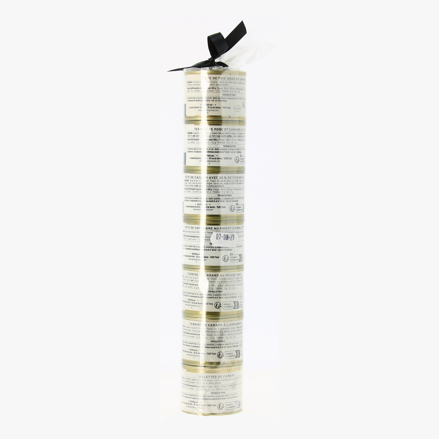 Terrine avec 20 % de foie gras d’oie : gorge de porc (origine : France), foie gras d’oie 20 %, viande de poule (origine : France), eau, OEUFS, foie de volaille, viande de canard confite (origine : France) (cuisse de canard désossée, graisse de canard, sel), gélatine, sel, Armagnac, Porto rouge, amidon modifié, épices, sucre, ail, romarin, arômes naturels