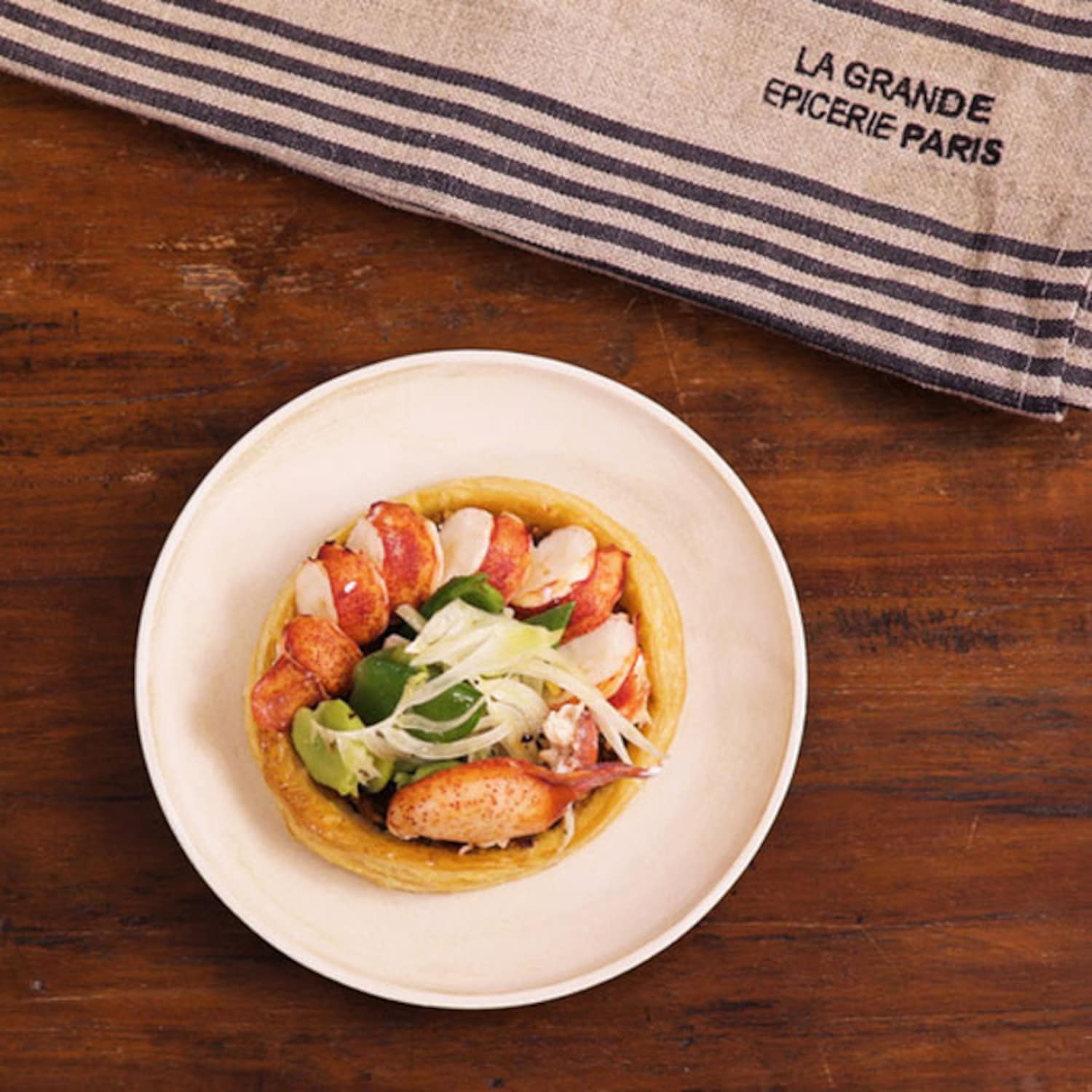 plat <b>1 pâte feuilletée :</b>| 4 queues de homard | Court-bouillon | 4 pinces de homard | <b>Pour le mélange de légumes croquants :</b>| 80 gr de Fenouil | 60 gr de Pois gourmands| 40 gr de Fèves pelées| 10 gr d’huile d’olive au citron | <b>Brunoise de légumes :</b>| 100 gr de carottes | 100 gr de cèleris | 100 gr de courgettes | 3gr d’estragon | 50 gr de sauce homardine | 5 gr Huile d’olive | Sel | Poivre <style type="text/css"> .background-video{ background:url(https://www.lagrandeepicerie.com/on/demandware.static/-/Sites-lge-master-catalog/fr/v1766376024786/images/recette/etapes/recette_saint-honoree.png) repeat; background-size: cover; cursor: pointer; } </style> <ul> <li class="step"> <div class="step-content"> <div class="video-portrait background-video"> <div class="thevid" style="position:relative;height:0;padding-bottom:56.25%"><span class="content"> <iframe allowfullscreen="" frameborder="0" height="360" id="thevid" src="https://www.youtube.com/embed/MRy4sBQITDo?rel=0&amp;showinfo=0&amp;hd=1&amp;autohide=1&amp;color=white" style="position:absolute;width:100%;height:100%;left:0" width="640"></iframe> </span></div> <div class="play-vid uppercase background-video"><!-- <span class="play-btn"></span> --></div> </div> </div> </li> <li class="step"> <div class="step-number"><span class="number">1</span></div> <div class="step-content"> <span class="content">Taillez en brunoise les carottes, le cèleri et les courgettes. Taillez le fenouil en julienne (soit en minces lanières de 4 à 5 cm sur 1 mm d'épaisseur). Taillez les pois gourmands en deux. </span> </div> </li> <li class="step"> <div class="step-number"><span class="number">2</span></div> <div class="step-content"> <span class="content">Placez les épluchures de légumes ainsi que le sachet de court-bouillon dans une casserole d’eau et portez à ébullition. </span> </div> </li> <li class="step"> <div class="step-number"><span class="number">3</span></div> <div class="step-content"> <span class="content">Faites poêler la brunoise dans une poêle chaude avec un filet d’huile d’olive. Assaisonnez avec du sel, du poivre et de l’estragon. Déglacez avec la sauce homardine (aussi appelée bisque de homard). </span> </div> </li> <li class="step"> <div class="step-number"><span class="number">4</span></div> <div class="step-content"> <span class="content">Découpez des disques de pâte feuilletée avec l’aide d’un cercle d’environ 10/12cm. Déposez au centre une cuillère à soupe de brunoise de légumes et étalez-la délicatement en laissant un demi-centimètre autour. </span> </div> </li> <li class="step "> <div class="step-number"><span class="number">5</span></div> <div class="step-content"> <span class="content">Faites cuire au four à 180°C durant 14 minutes.</span> </div> </li> <li class="step "> <div class="step-number"><span class="number">5</span></div> <div class="step-content"> <span class="content">Plongez le homard dans le court-bouillon durant 8 minutes pour les pinces et 10 minutes pour les queues. Faites cuire les pois gourmands dans un grand volume d’eau bouillante salée, quelques minutes. Stoppez la cuisson des pois gourmands en les plongeant dans un bain d’eau glacée. </span> </div> </li> <li class="step "> <div class="step-number"><span class="number">5</span></div> <div class="step-content"> <span class="content">Une fois refroidie, déposez la queue de homard sur la tarte fine. Assaisonnez les légumes croquants avec l’huile d’olive au citron puis déposez-les sur la tarte. "</span> </div> </li> </ul> French https://www.youtube.com/embed/MRy4sBQITDo PT30M PT25M