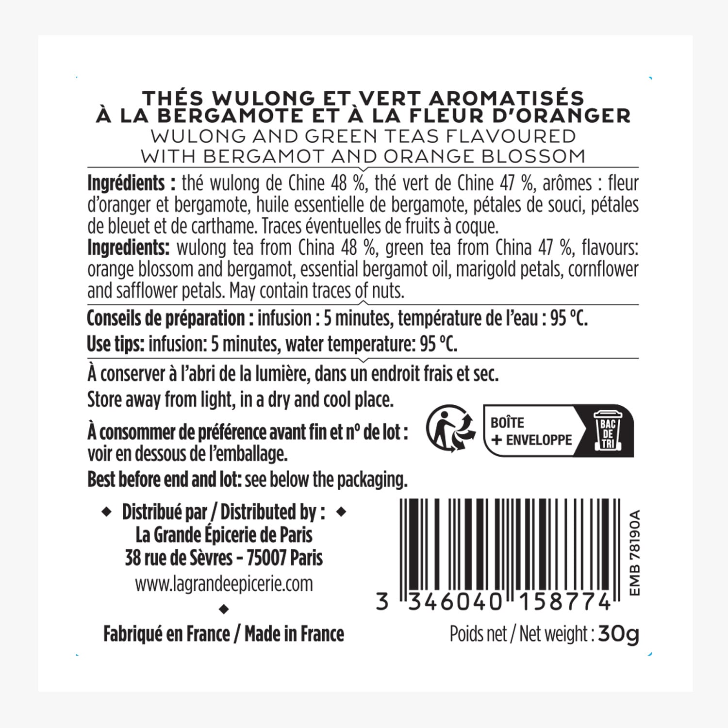Lady Néroli thé vert Earl Grey parfumé à la fleur d'oranger 15 sachets individuels La Grande Épicerie de Paris