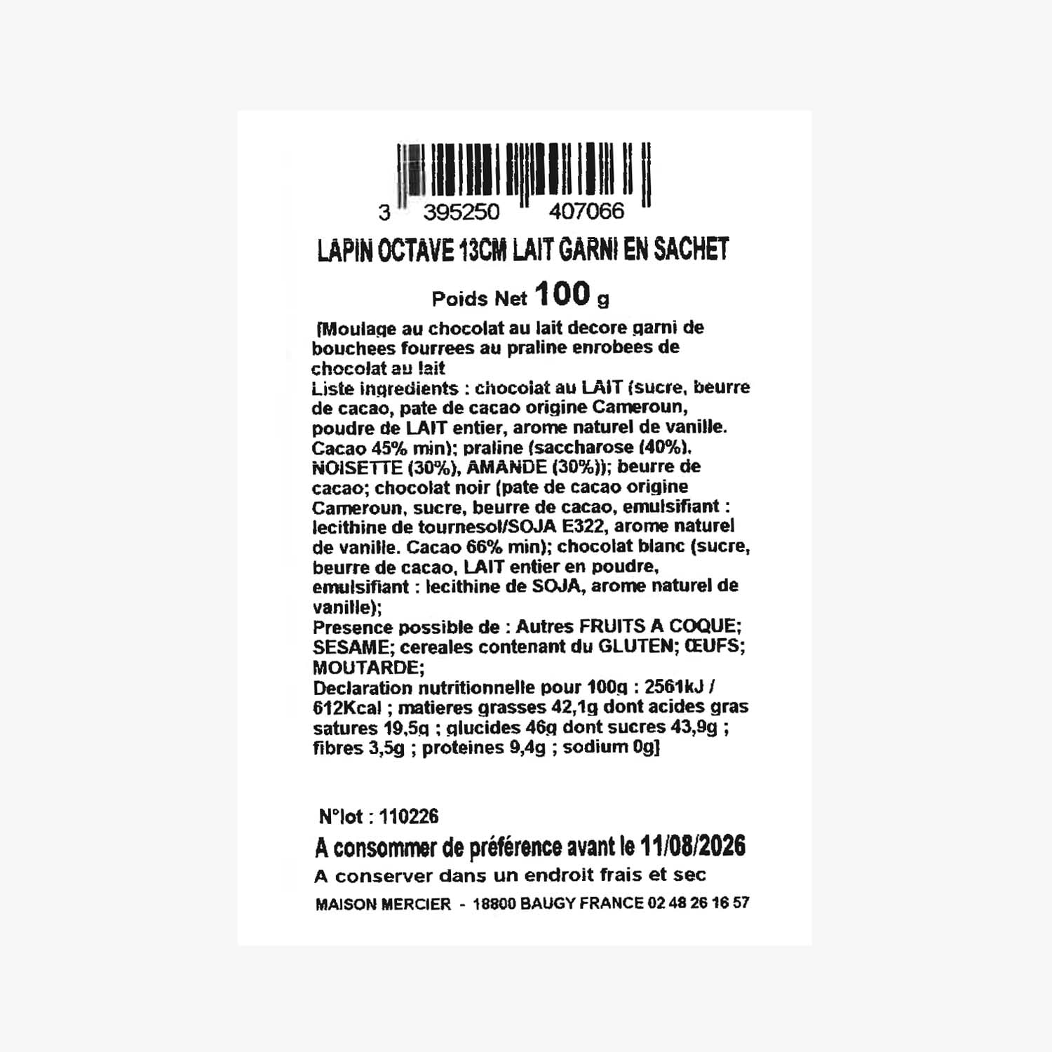 Lapin cacahuète 13 cm chocolat lait moulage