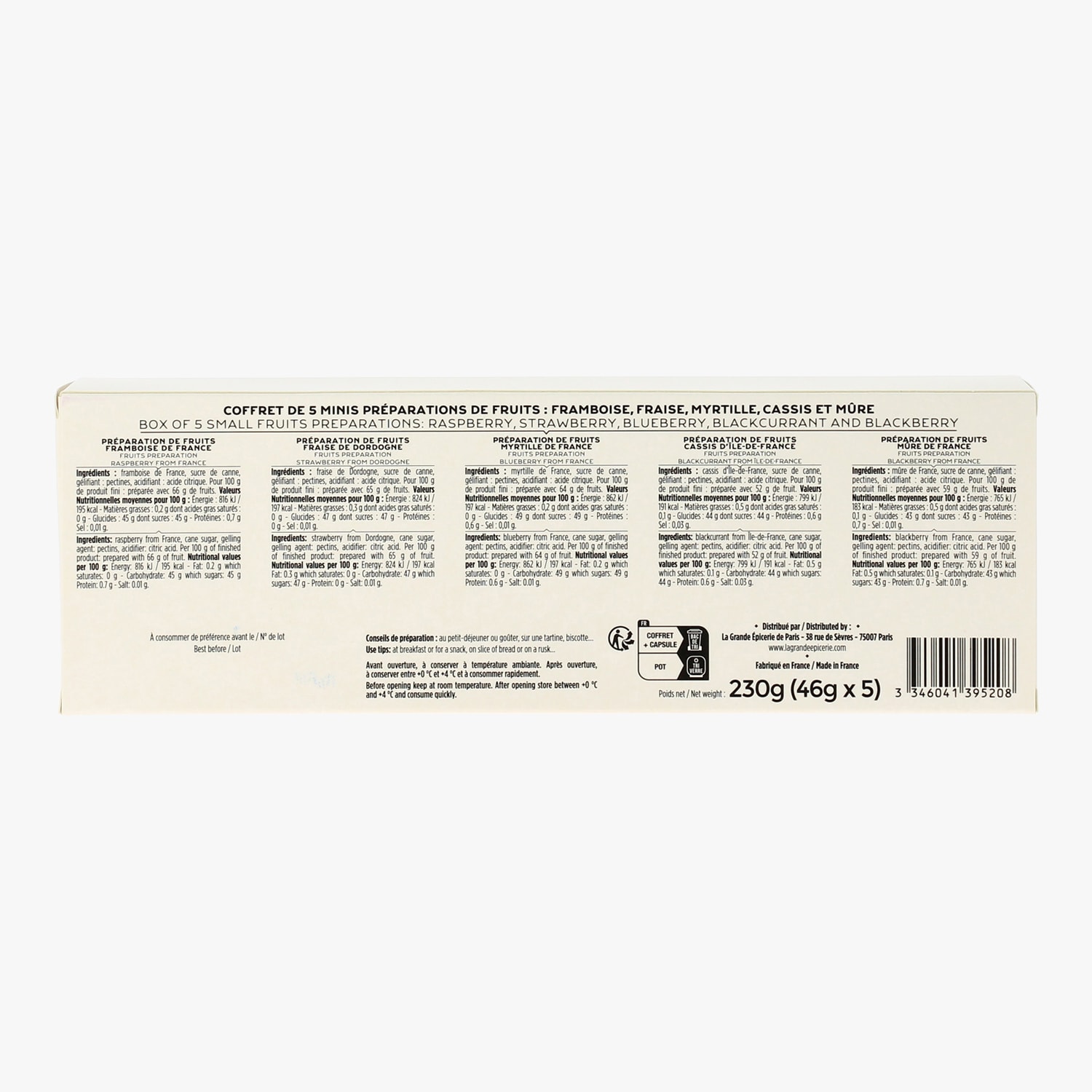 Coffret de 5 mini préparations de fruits : framboise, fraise, myrtille, cassis et mûre