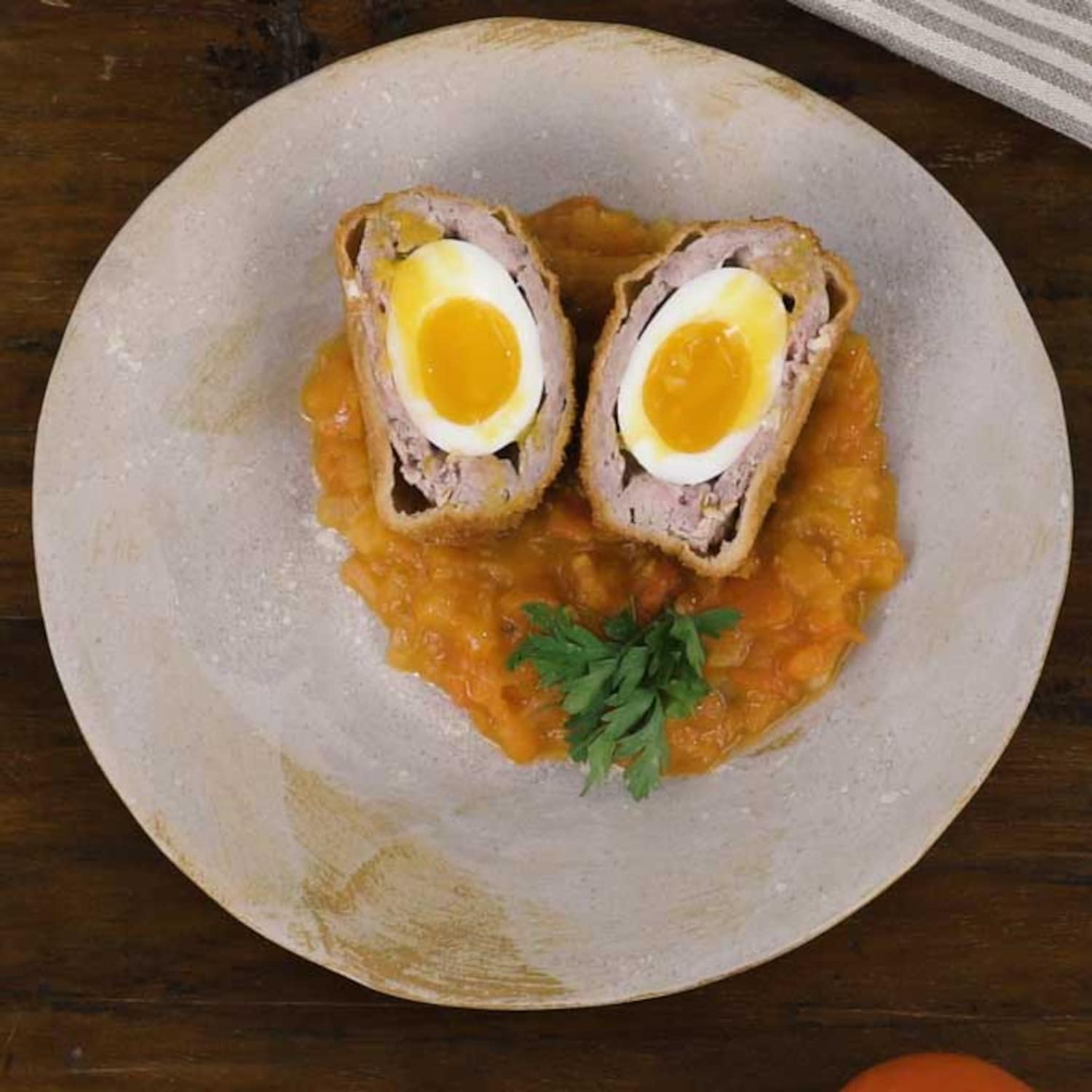 <b>Farce de viandes :</b>| 200gr de palette (hachée chez votre boucher) | 200gr d’épaule de veau (hachée chez votre boucher) | 2gr de muscade | Sel/poivre | 4 œufs (à cuire en œuf dur) | 2 œufs (pour panure) | 200gr de farine | 200gr de chapelure | <b>Sauce tomate : </b>| 4 grosses tomates | 1 oignon | 1 branche et 1 feuille de chaque : aromates (thym, laurier) | 25gr de concentré de tomate | 50gr de sucre | 50gr d’huile d’olive