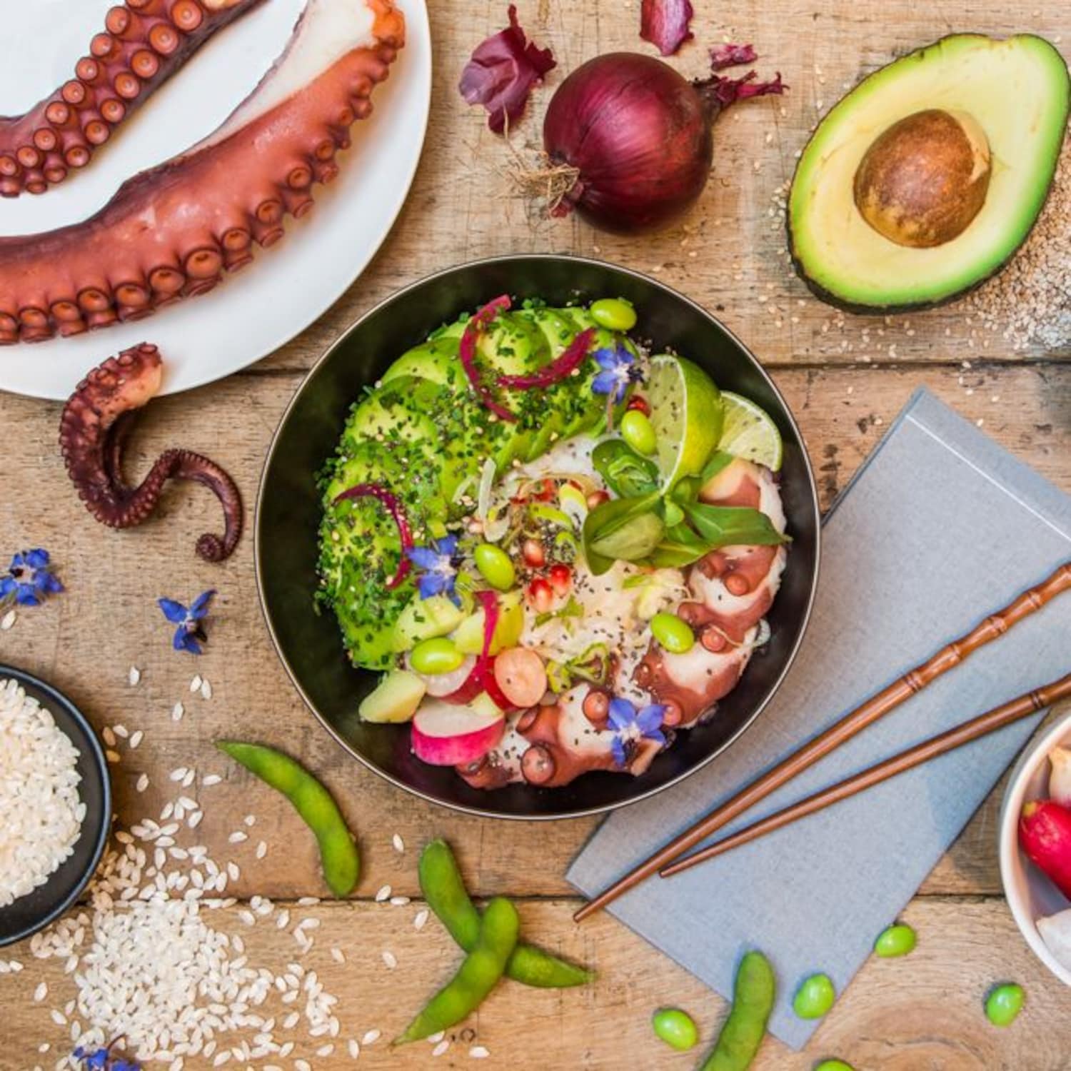 350g de tentacules de poulpe | 2 avocats | 350g de riz à sushi | 1 citron vert | 100 g d’edamame | 1 botte de radis roses | graines de sésame | oignon rouge | graines de grenade | 1 botte de ciboulette | vinaigre de riz | huile d’olive | 1 concombre