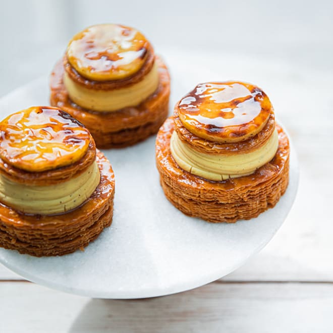 Vous connaissez certainement les pasteis de nata. Ils ornent les devantures de la plupart des boulangeries portugaises locales et se dégustent tièdes afin que la crème perde légèrement en fermeté pour ensuite révéler toute son onctuosité. Bien qu’aujourd’hui, cette pâtisserie soit très répandue, son histoire est intimement liée à la petite ville de Belém. C’est dans cette commune historique que les moines du monastère de Jeronimos ont commencé à vendre les premiers pasteis de nata dans une boulangerie typique. Nos chefs, très attachés aux traditions, se sont inspirés de ce dessert emblématique de la cuisine lusitanienne, réputé pour sa crème onctueuse et parfumée, afin d’en proposer une version revisitée. Le relief de cette création s’explique par la superposition de plusieurs couches afin que les saveurs se dévoilent les unes après les autres pour un moment de plaisir unique. Nos chefs ont tout d’abord réalisé à la main leur pâte feuilletée surmontée d’un savoureux crémeux à la vanille sur lequel est disposé une crème et un sirop à la cannelle. L’accord parfait de la douceur et du caractère !