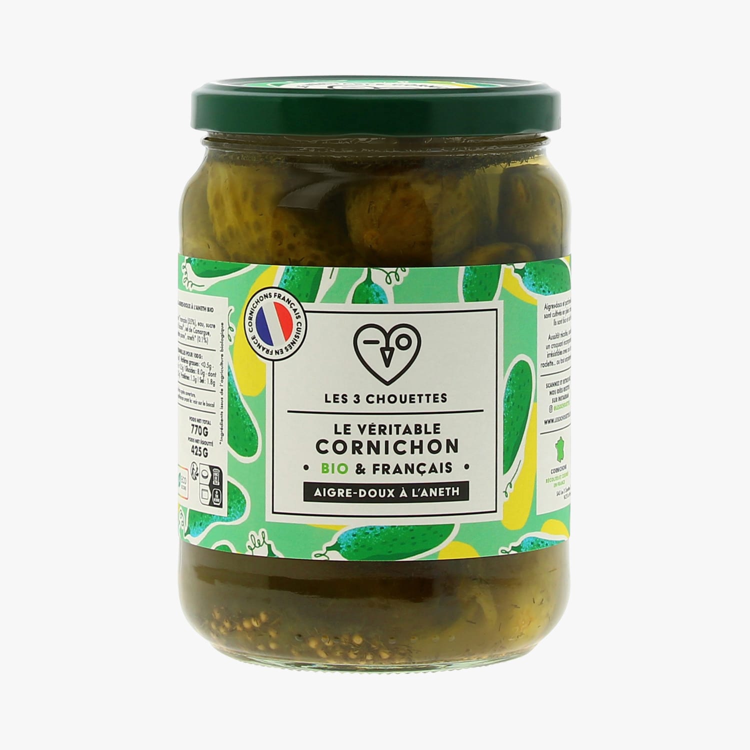Le véritable Cornichons bio et français - aigres-doux à l'aneth Les 3 chouettes