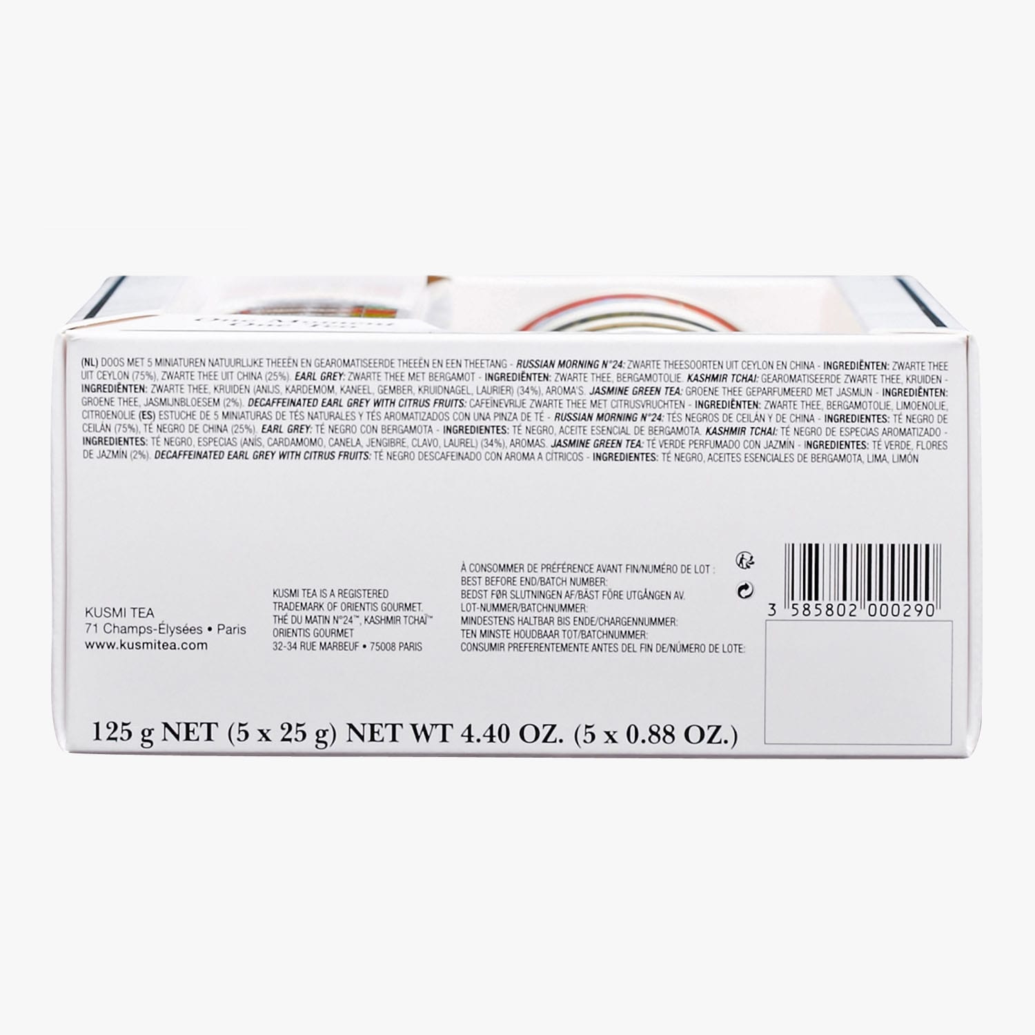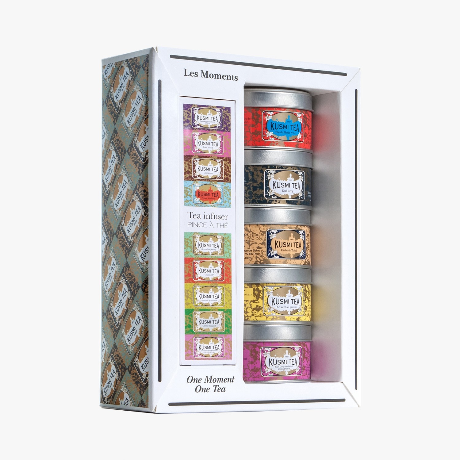 Coffret de 5 miniatures de thés natures et de thés aromatisés avec une pince à thé