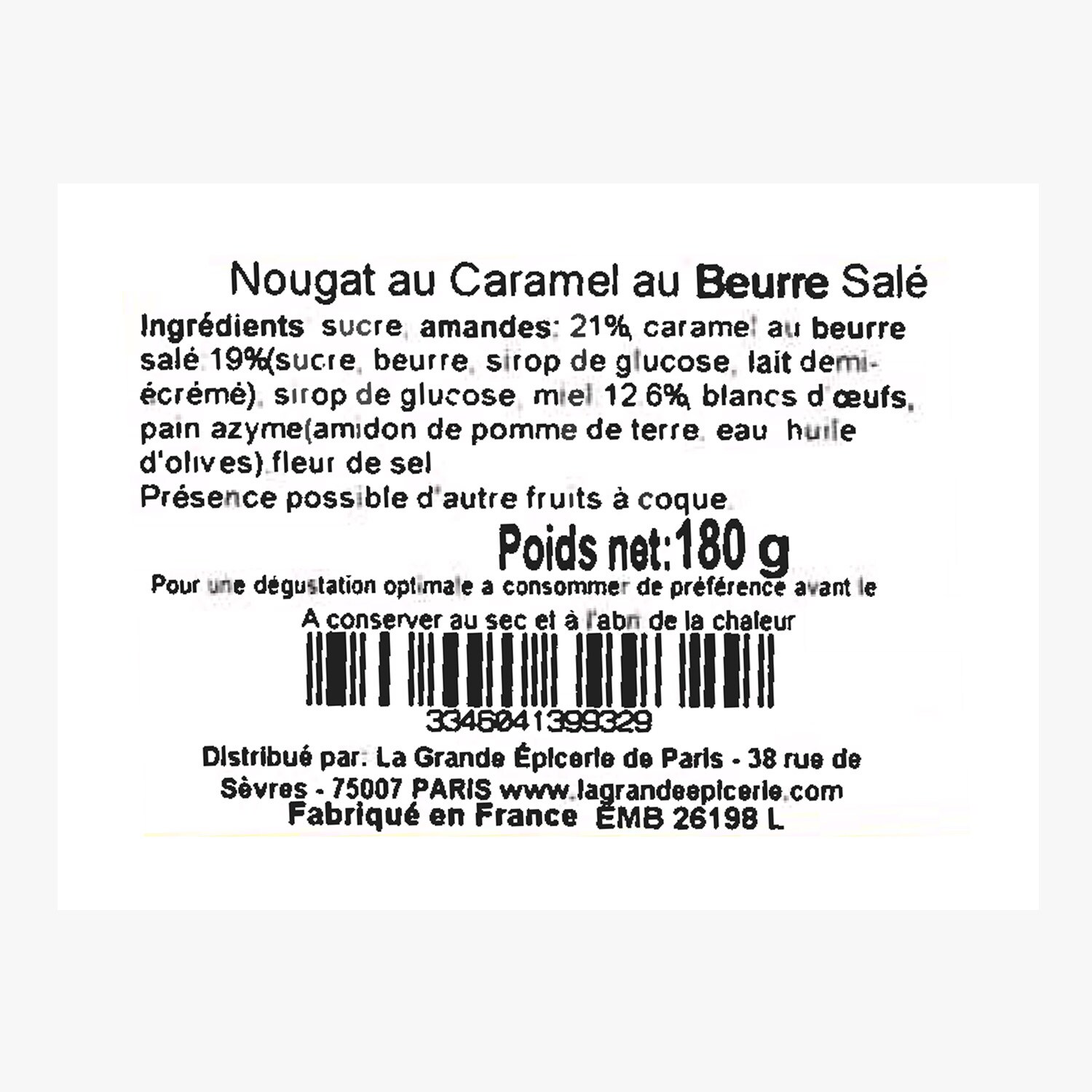 Sucre, AMANDES 21%, caramel au BEURRE salé 19% (sucre, BEURRE, sirop de glucose, LAIT demi-écrémé), sirop de glucose, miel 12,6%, blancs d'ŒUFS, pain azyme (amidon de pomme de terre, eau, huile végétale d'olives), fleur de sel.