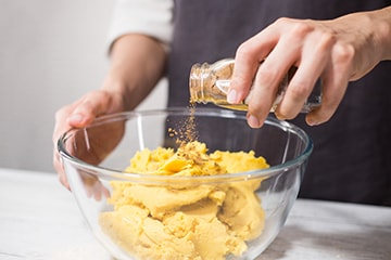 3Dans un grand saladier, mélangez la farine, le sucre, le jaune d'œuf, le sel et les épices ensemble.