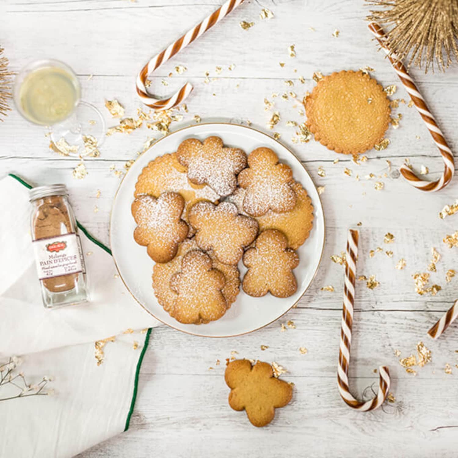 100g de farine de blé T 45 ou 55 | 45g de sucre glace | 1 pincée de sel | 1 jaune d'oeuf | 15g d'épices à pain d'épices | 90g de beurre