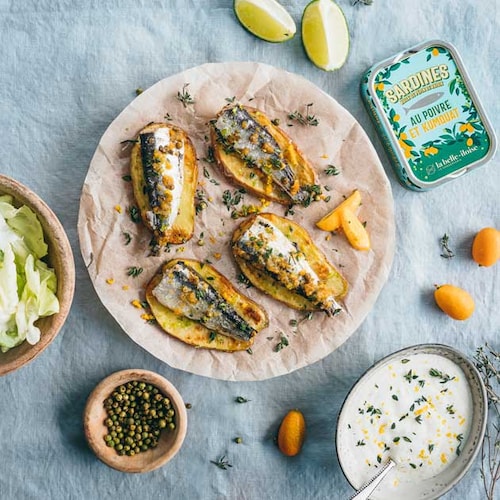 Boîte de sardines à l’huile de pépins de raisin, au poivre vert et au kumquat
