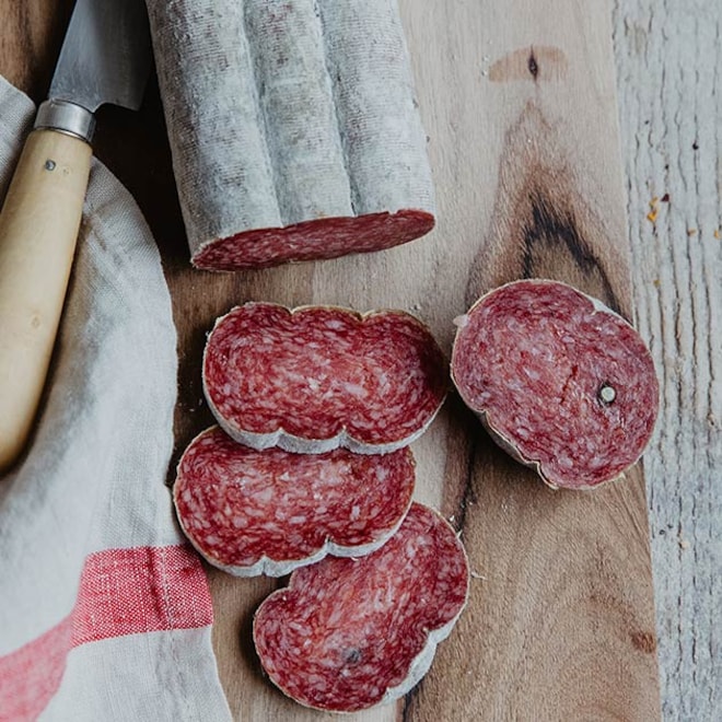 Aux côtés du Jésus, la saucisse sèche se décline au sel de Guérande, au roquefort ou aux olives. Elle voisine avec le saucisson sec pur porc, agrémenté de noisettes ou d’herbes.
