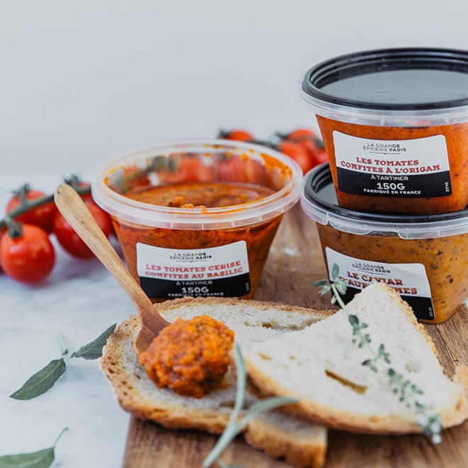 Préparés à partir de légumes découpés, confits ou grillés, nos légumes tartinables et marinés illuminent apéritifs et créations culinaires. Mélangés à des huiles et herbes aromatiques, tomates, artichauts, poivrons apportent leurs saveurs méditerranéennes aux verrines, omelettes et bruschetta.