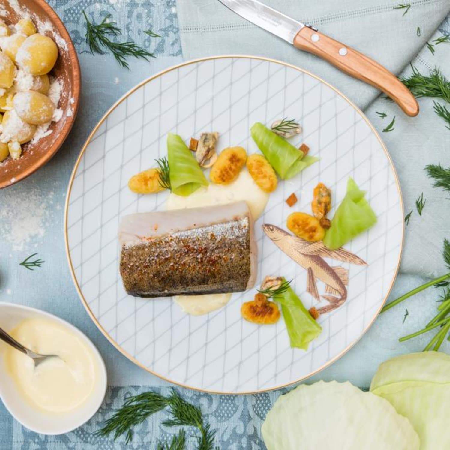 9Chauffez une poêle puis déposez vos pavés de lieu côté peau. Laissez cuire jusqu’à ce que la peau soit bien croustillante, puis faite cuire sur l’autre face pendant 2 à 3 minutes. Ajoutez les gnocchis, faites-les dorer puis dressez.