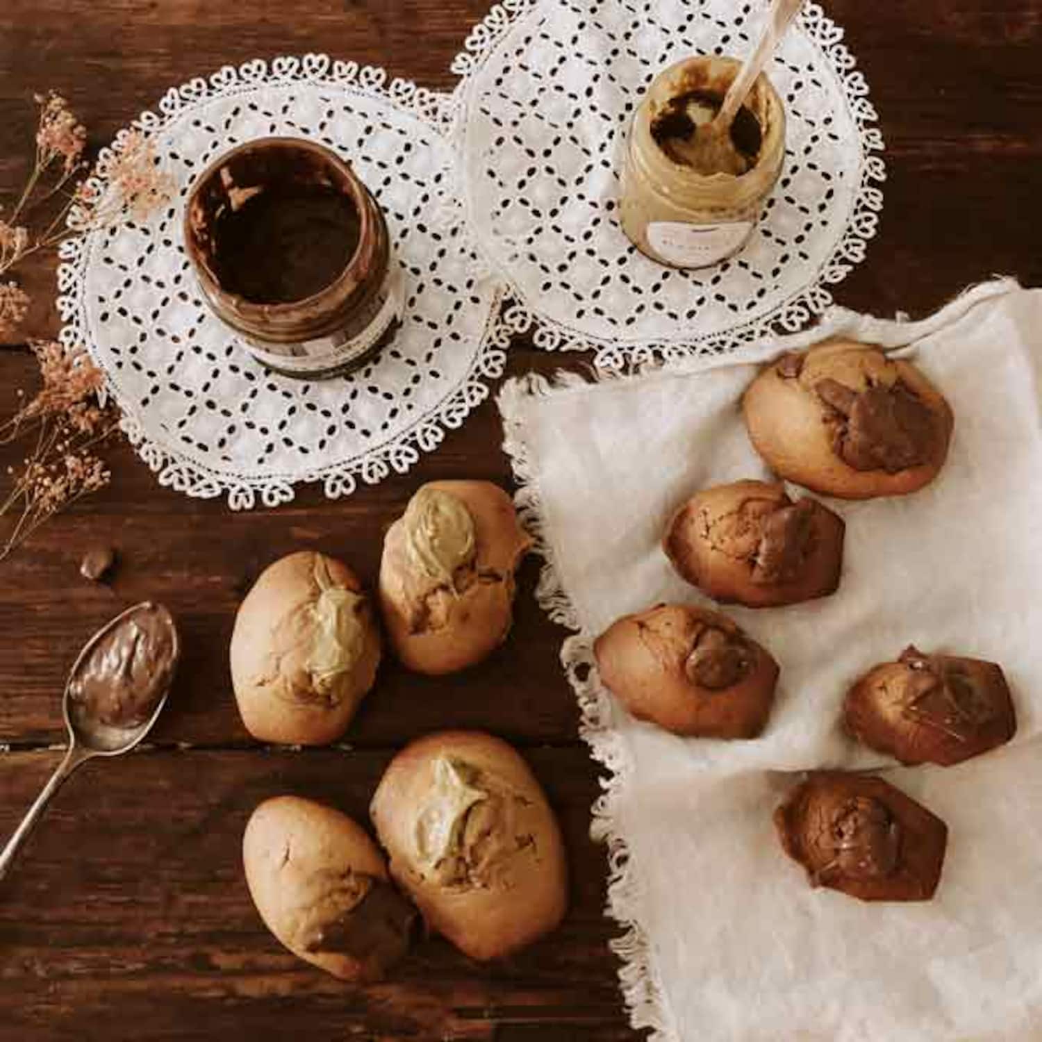 4Mettez au four à 200 degrés pendant 5 minutes puis versez, avec une poche à douille ou une petite cuillère, la pâte à tartiner à la pistache ou à la noisette dans chaque moule.