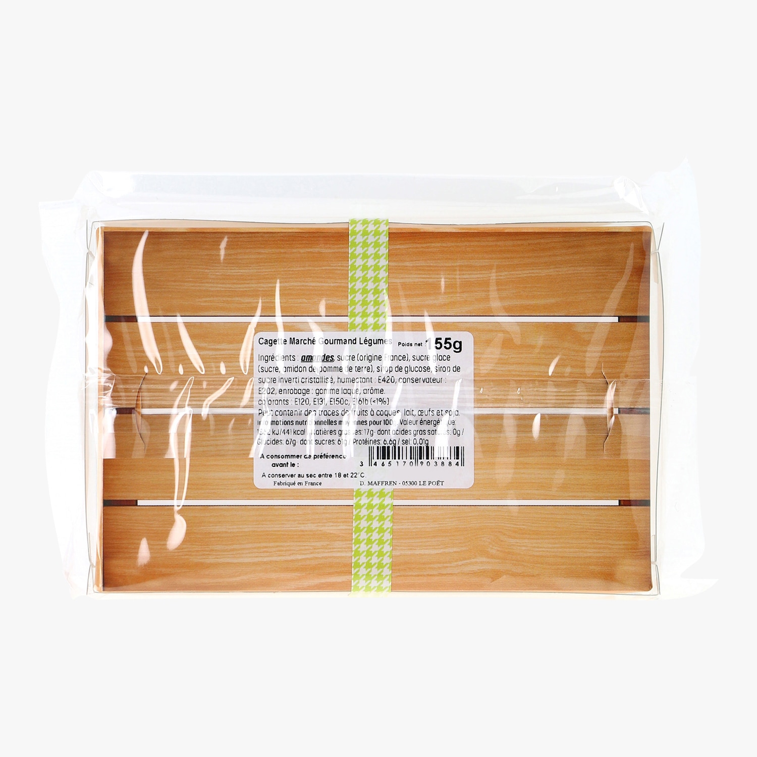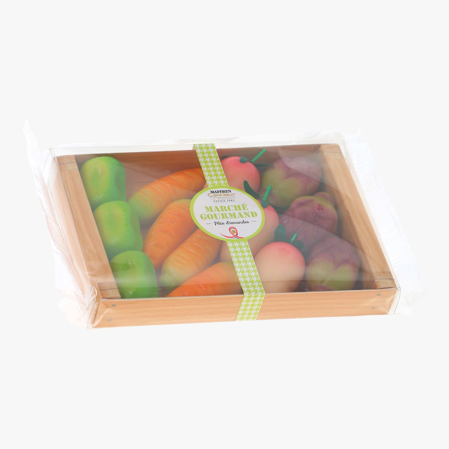 Le célèbre confiseur Maffren nous propose ici un véritable assortiment de légumes en pâte d'amandes confectionnés et décorés à la main. Ils sont présentés dans leur petite cagette en bois, comme au marché. Bref, un vrai régal pour les papilles comme pour les yeux.